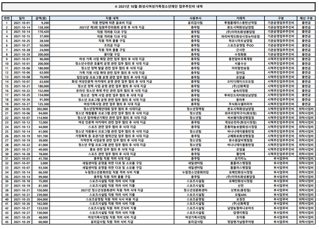 제목 업무추진비 2021년 10월 업무추진비 내역 작성일 2021년 11월 23일 10시 3분 조회수 391 첨부 파일 아이콘2021년 10월 업무추진비 내역.pdf (103.67KB)다운로드 아이콘 파일 아이콘2021년 10월 업무추진비 내역.png (506.08KB)다운로드 아이콘 목록보기