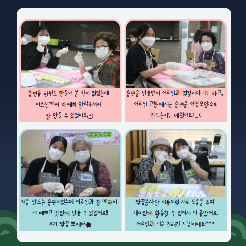 지난 9월 11일(토), 추석을 앞두고 짝꿍봉사단의 송편만들기 활동이 진행되었습니다. 오랜만에 만난 짝꿍어르신과 반갑게 인사하고, 송편을 만들며 도란도란 이야기를 나누니 정말 명절느낌...♥ 다 같이 먹지는 못했지만 집에서 쪄먹어보니 정말 맛있었다는 후기가 가득했답니다=) 다음 10월 정기활동도 기대해주세요^^ *2021 짝꿍봉사단 활동은 화성시청소년수련관과 동탄치동천종합사회복지관이 연계하여 운영됩니다. |