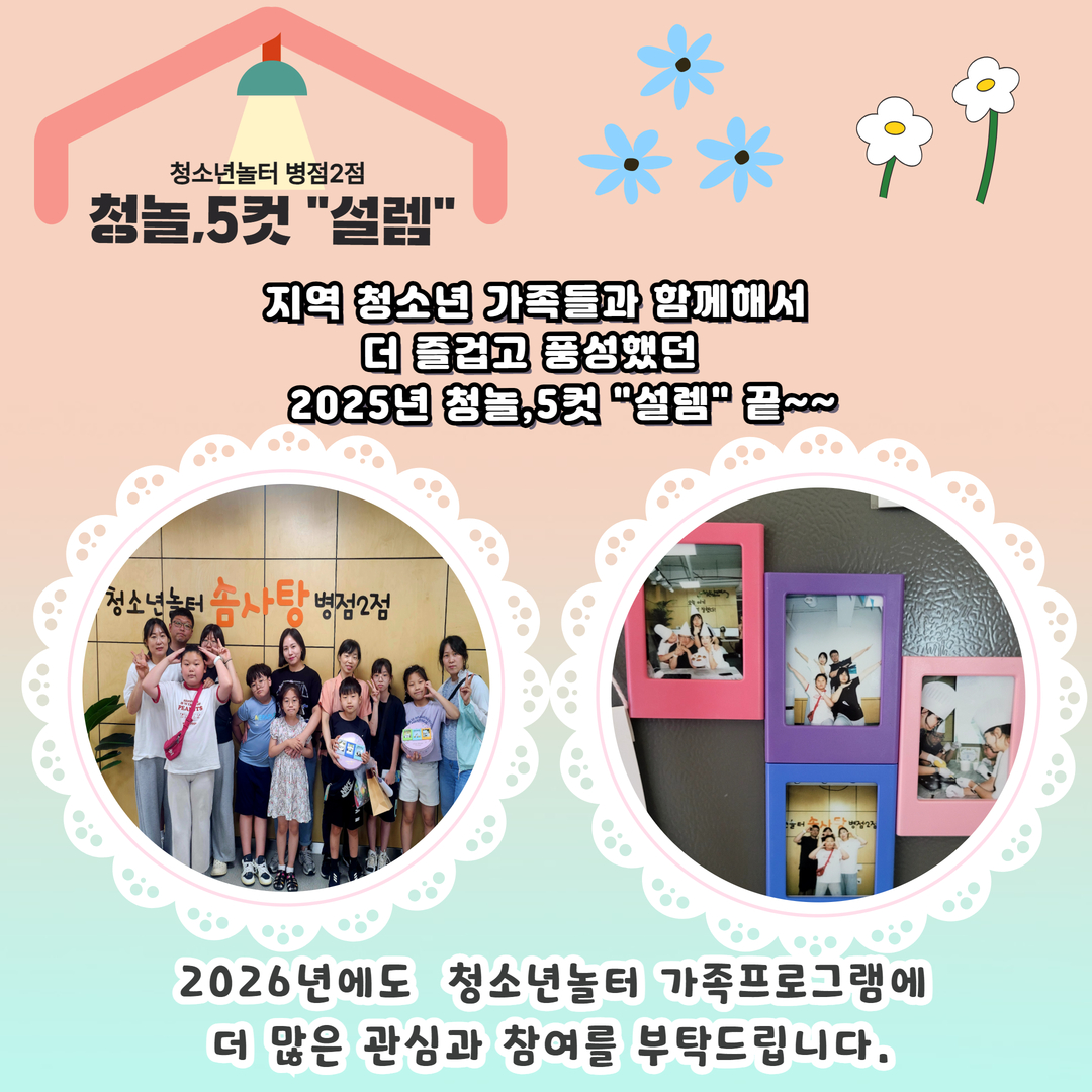 <3면> 청소년놀터 병점2점 청놀,5컷 설렘2 가족오락관 디딤 플레이 <4면> 청소년놀터 병점2점 청놀,5컷 설렘3 우리 가족 마들렌 쿠키 완성! <5면> 청소년놀터 병점2점 청놀,5컷 설렘4 지역 청소년 가족들과 함께해서 더 즐겁고 풍성했던 2025년 청놀,5컷 설렘 끝~~~! 2026년에도 청소년놀터 가족프로그램에 더 많은 괌심과 참여를 부탁드립니다.