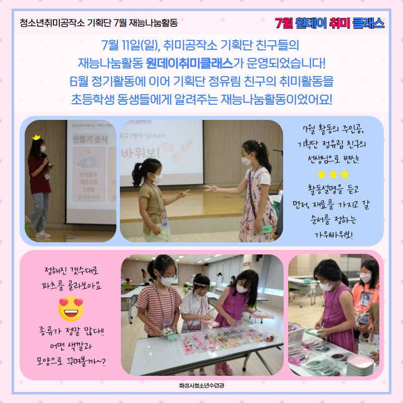 [화성시청소년수련관] 취미공작소 기획단 7월 재능나눔활동 '원데이취미클래스' 재단에 바랍니다 상세 운영센터 유앤아이센터 등록일 2021년 7월 31일 15시 2분 조회수 762 #화성시청소년수련관#청소년취미공작소#취미공작소기획단#재능나눔활동#원데이취미클래스7월 11일(일), 취미공작소 기획단 친구들이 직접 준비한원데이취미클래스가 진행되었습니다!다양한 파츠와 생크림본드로나만의 손거울, 필통을 꾸며보았어요=)다음 재능나눔활동도 기대해주세요^^#청소년여가 #알찬 #취미활동 목록보기