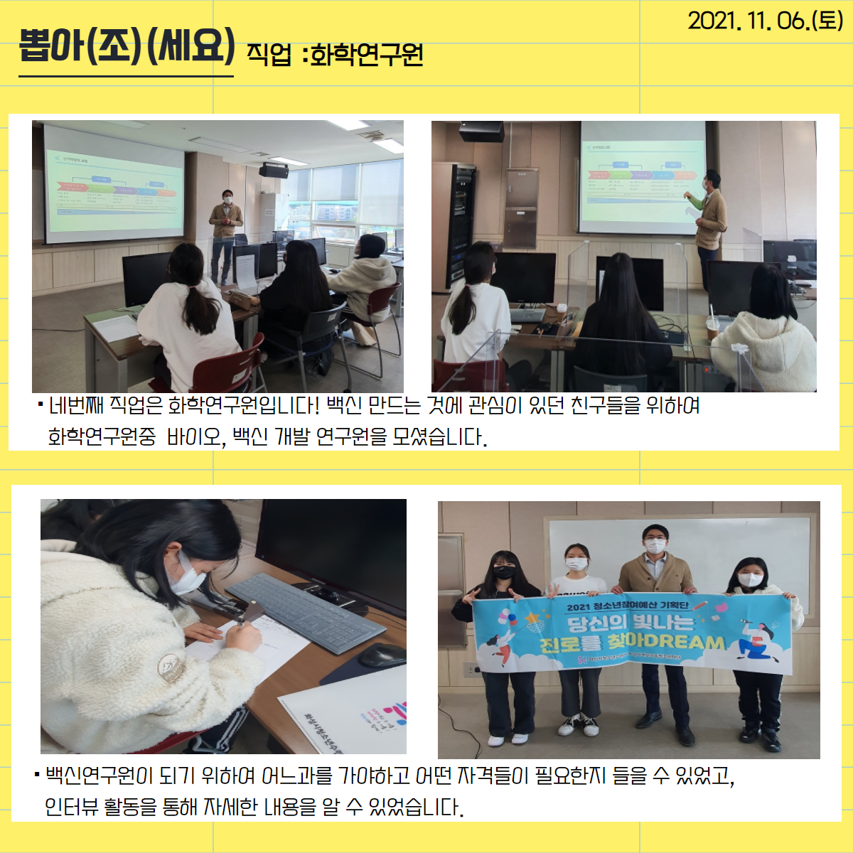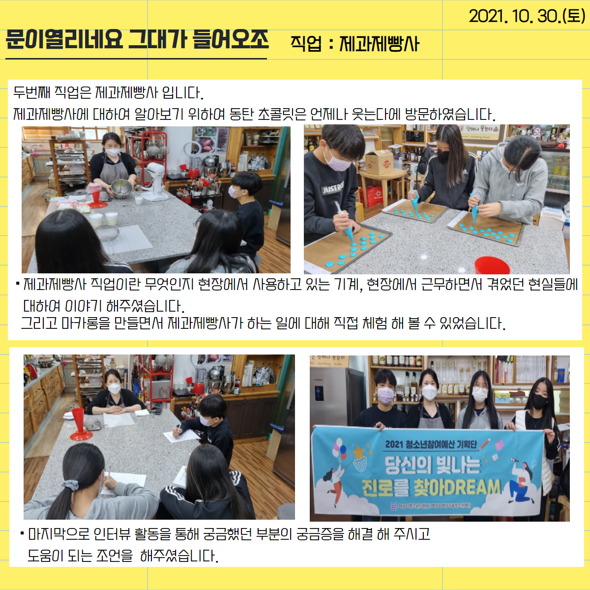 2차에서는 '화학연구원', '디저트요리사', '애니메이터', '제과제빵사' 직업에 대하여 인터뷰하고 체험활동을 진행했습니다.