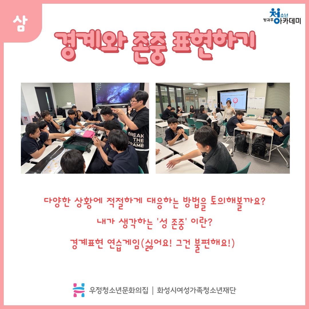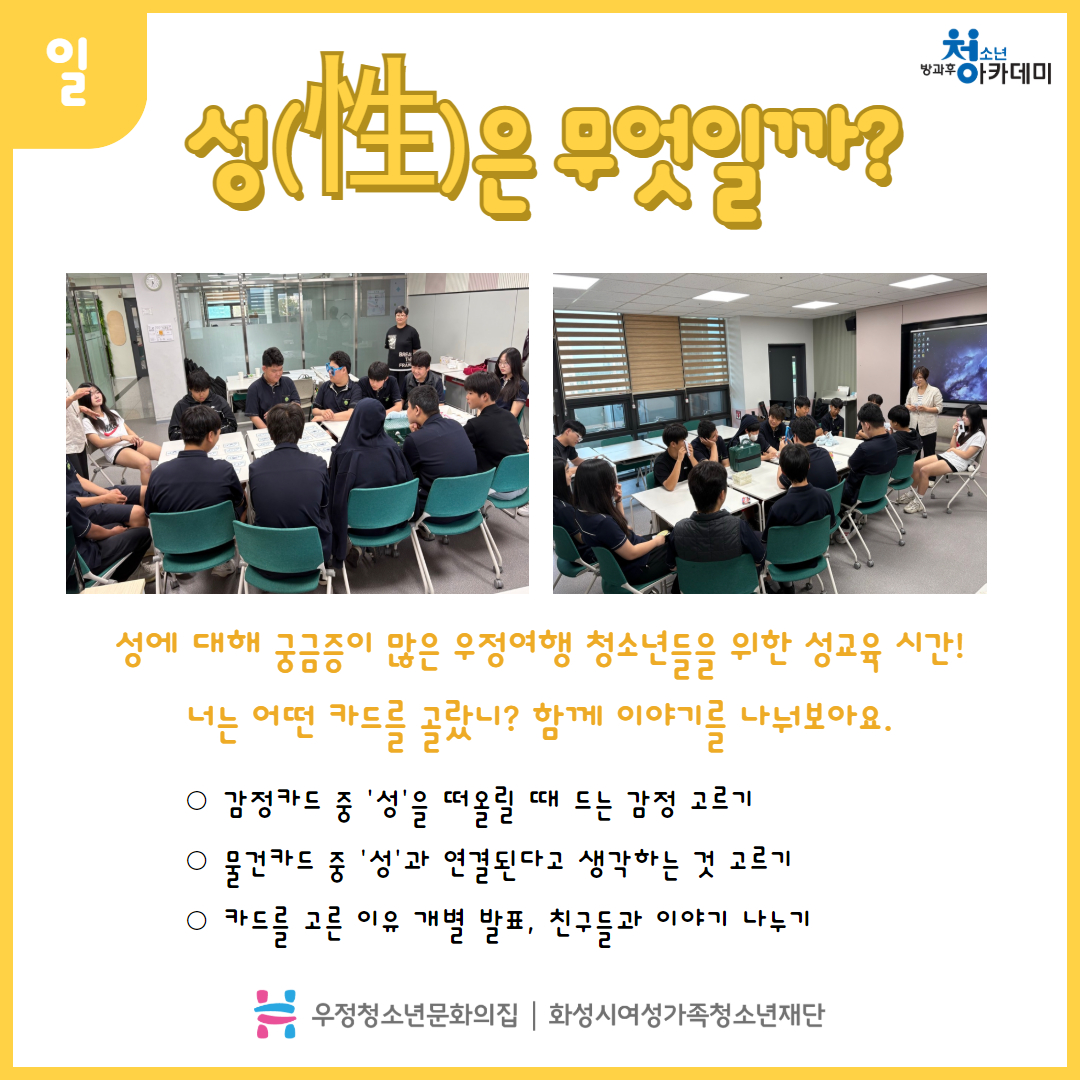 [우정청소년문화의집] 우정청소년방과후아카데미 지역연계 참여형 교실 성교육 "내몸네몸 알기" 진행 재단에 바랍니다 상세 운영센터 화성시여성가족청소년재단 등록일 2025년 6월 2일 11시 19분 조회수 180 안녕하세요. 우정청소년문화의집 방과후아카데미 우정여행입니다.지난 5월 30일, 화성시청소년성문화센터와 연계한 참여형/체험형 교실 성교육 프로그램이 진행되었습니다.성교육의 주제는 자신의 몸에 대해 정확하게 알고, 성에 대한 왜곡된 정보를 바로잡으며건강하고 올바른 성 가치관을 형성할 수 있는 '내몸네몸 알기'!궁금한 것들이 많았던 일부 청소년들은 선생님께 열정적으로 질문을 하기도 했습니다. 지역연계 프로그램으로 진행된 우정여행 성교육,그리고 하반기 후속 프로그램으로 진행될 1:1 찾아가는 맞춤형 청소년 개별 성상담까지!카드뉴스로 만나보시죠~ 파일 아이콘방카 성교육 1.jpg (493.85KB)다운로드 아이콘 파일 아이콘방카 성교육.zip (2.6MB)다운로드 아이콘 목록보기
