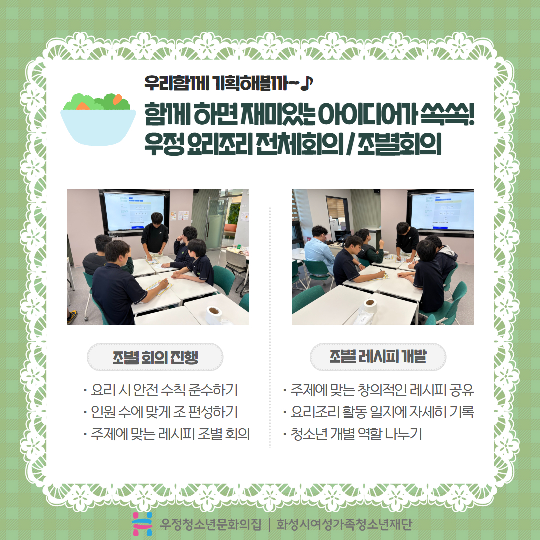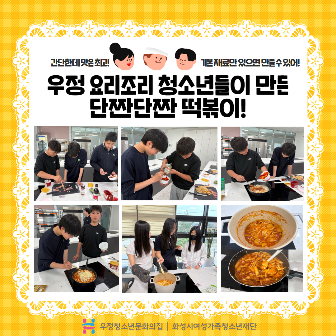 안녕하세요^_^! 우정청소년문화의집 방과후아카데미 우정여행입니다. ? 우정여행 청소년들은 우정 요리조리(요리 동아리)와 우정 챔피언(체육 동아리)로 나뉘어 매주 활동을 하고 있습니다. 오늘은 우정 요리조리 청소년들의 두 번째 활동일지로 돌아왔는데요~그동안 어떤 요리를 만들었는지, 어떤 레시피를 연구했는지 함께 보시죠!
