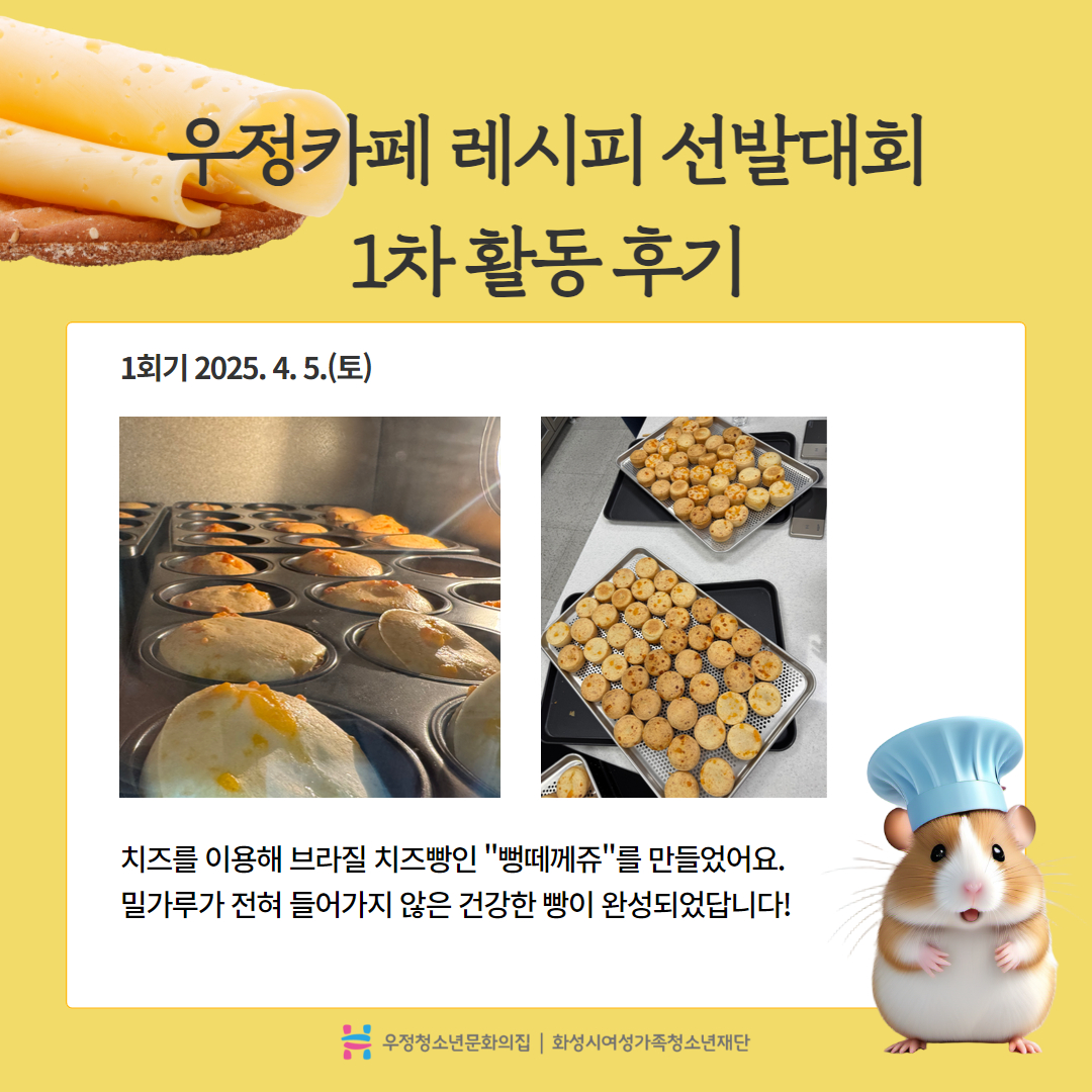 치즈는 단백질이(20~30%), 지방, 칼슘, 미네랄, 프로바이오틱스로 구성되어 있어요. 치즈를 이용해 브라질 치즈빵인 "뻥떼께쥬"를 만들었어요. 밀가루가 전혀 들어가지 않은 건강한 빵이 완성되었답니다! 점심을 먹고 오후시간에는 각자 치즈로 만든 레시피를 구상해보는 시간을 가졌어요! 미니치즈피자, 체다치즈 과자, 투움바 라면, 치즈 토스트, 라이스페이퍼 치즈스틱 등 평소에 청소년들이 쉽게 접할 수 있는 재료로 쉽게 만들 수 있는 레시피가 나왔어요! 점심을 먹고 오후시간에는 각자 치즈로 만든 레시피를 구상해보는 시간을 가졌어요! 미니치즈피자, 체다치즈 과자, 투움바 라면, 치즈 토스트, 라이스페이퍼 치즈스틱 등 평소에 청소년들이 쉽게 접할 수 있는 재료로 쉽게 만들 수 있는 레시피가 나왔어요! 회의를 통해 최종 선정된 메뉴는 "미니치즈피자"였답니다! 1회기에서 선정된 메뉴인 "미니 치즈피자"를 만들어보는 시간을 가졌어요! 강사선생님 없이 직접 구상한 재료와 레시피로 만들었답니다. 1인당 2판의 피자를 완성하여 1층 우정카페에서 문화의집을 이용하는 청소년들에게 나눔활동까지 진행했답니다. 참가 청소년 만족도 88.9% 도출되었으며, '덕분에 요리 실력이 늘었다', '피자를 만들고 사람들에게 나눠줘서 좋았다' 등의 의견이 나왔답니다! 우정레시피 선발대회 2차는 5.10.(토), 5.17.(토) 2회기로 운영될 예정입니다. "계란"을 주제로 계란에 대한 재료이해, 계란빵 만들기, 나눔활동 등으로 진행됩니다. 관심있는 청소년들의 많은 참여 바랍니다. |