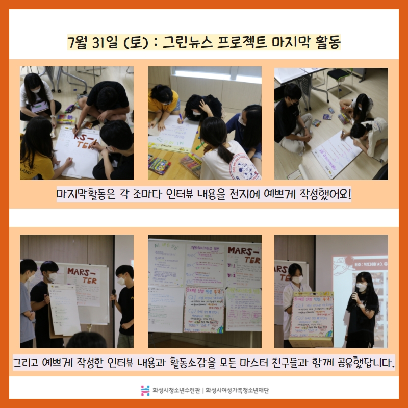7월 17일(토)~7월 31(토), 화성을 지키는 청소년 '마스터(mars-ter)' 를 진행했습니다. 이번에는 중&고등 마스터 친구들이 모여 제로웨이스트 체험단 활동을 했습니다. 마스터 친구들이 모여 어떻게 활동을 진행했는지 궁금하시다면 아래에 카드뉴스를 참고해주세요♥ |