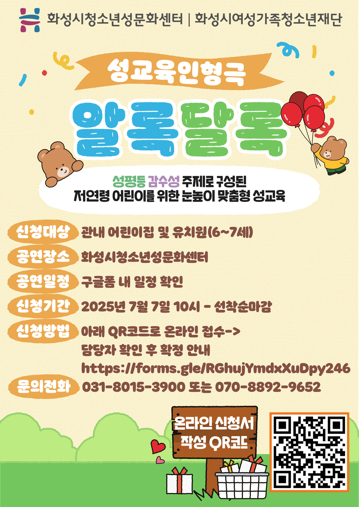2025년 9~11월 「알록 달록」 성교육인형극 신청 안내 #일자 및 교육주제 - 일자: 구글 폼 내 일정 참고 - 주제: 성평등 감수성 ※ 회차 상황에 따라 모집 인원이나 일정은 달라질 수 있습니다. ※ 공휴일은 공연이 진행되지 않습니다. #공연시간: 약 40분 #대상: - 화성시 관내 저연령 어린이(6~7세), 인솔자 및 지도자 등 - 회차당 40~50명 ※ 최소 40명이상이 되어야 공연진행 가능 합니다. #신청기간: - 2025년 7월 7일(월) 10시 ~ 마감시까지 #신청방법: - 신청서 작성 → 담당자 확정 안내(문자 or 전화) #장소: 화성시청소년성문화센터(화성시 여울로2길 33) #비용: 화성시청소년성문화센터 전액지원 |