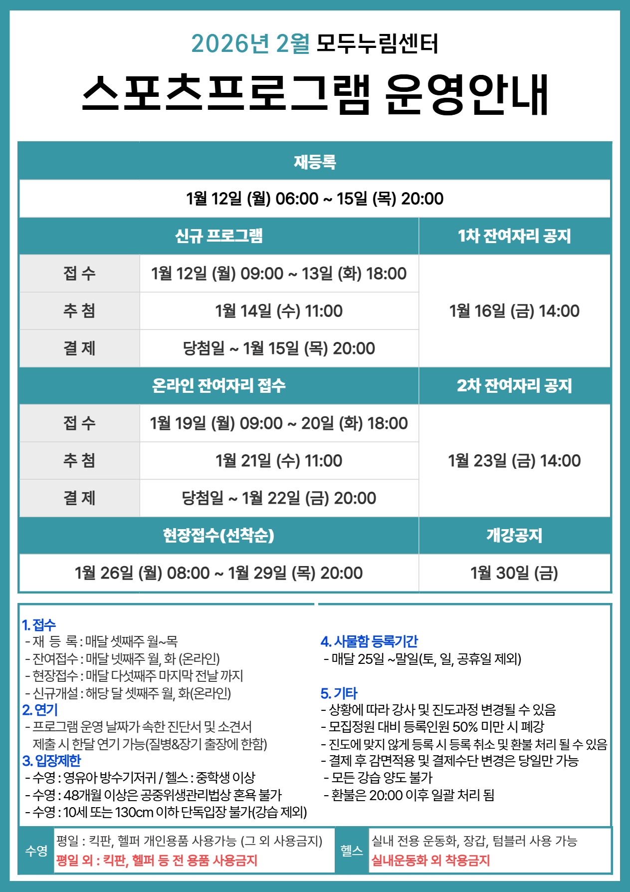 | 제목 | [모두누림센터] 2026년 2월 스포츠프로그램 운영 안내 | ||