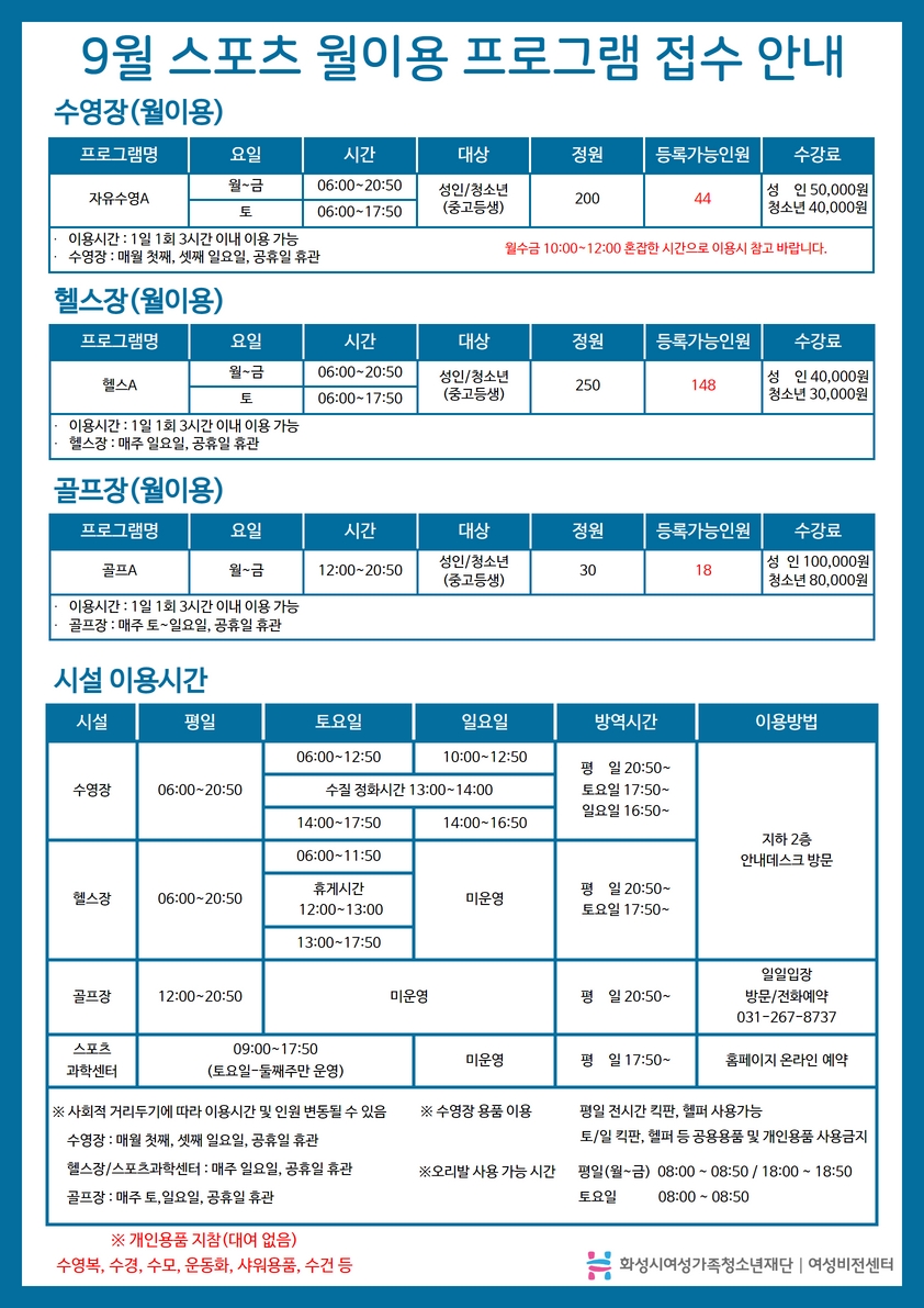 | 제목 | [유앤아이센터]9월 스포츠 프로그램(수영, 헬스, 골프) 잔여자리 공지 안내 (2022. 08. 29. 11:00기준) | ||
