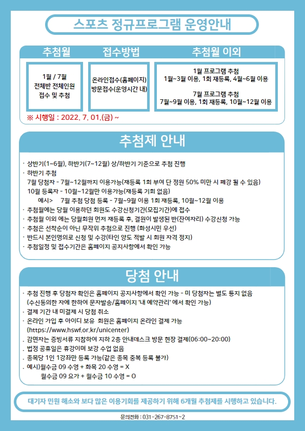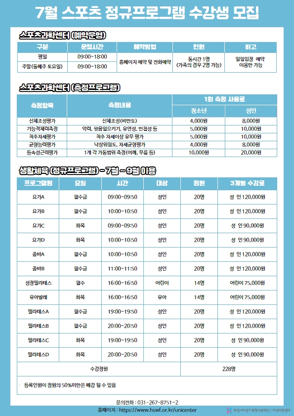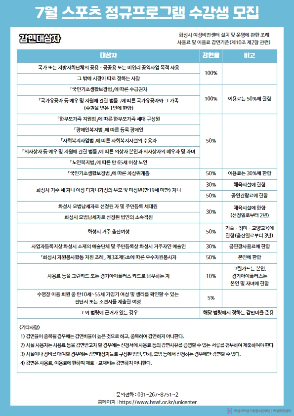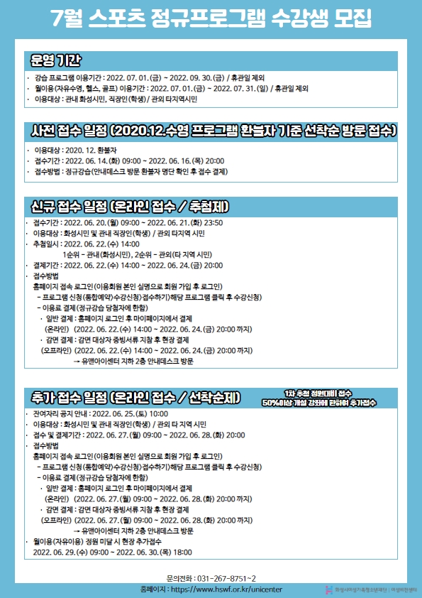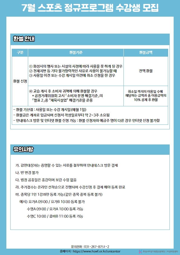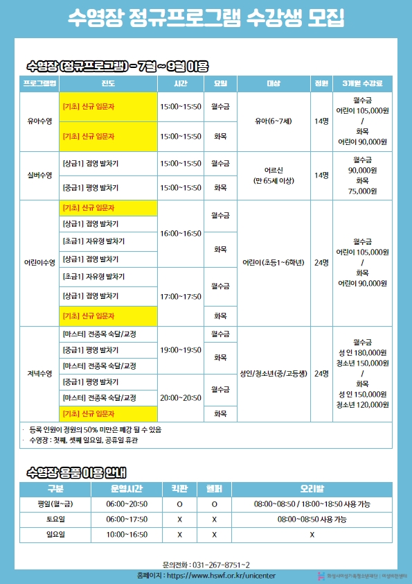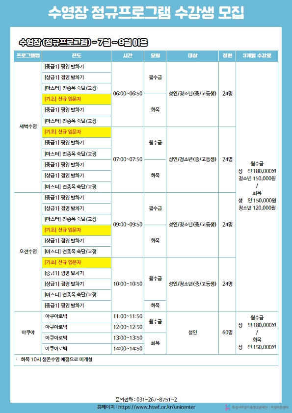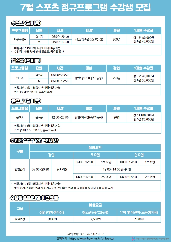 | 제목 | [유앤아이센터] 7월 스포츠 프로그램(수영, 헬스, 골프, 생활체육) 수강생 모집 안내 | ||