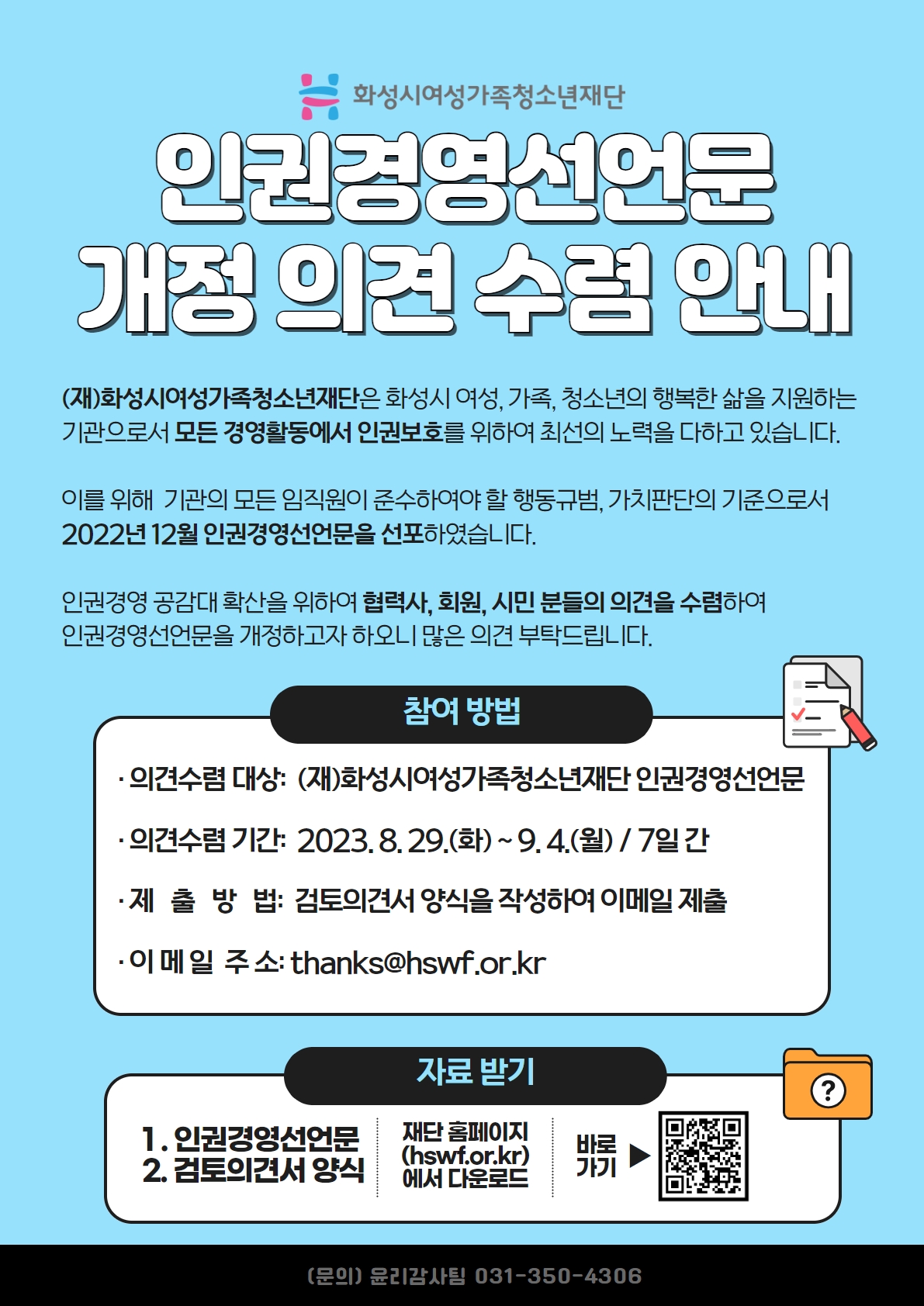 (재)화성시여성가족청소년재단 인권경영선언문 개정 의견 수렴 안내