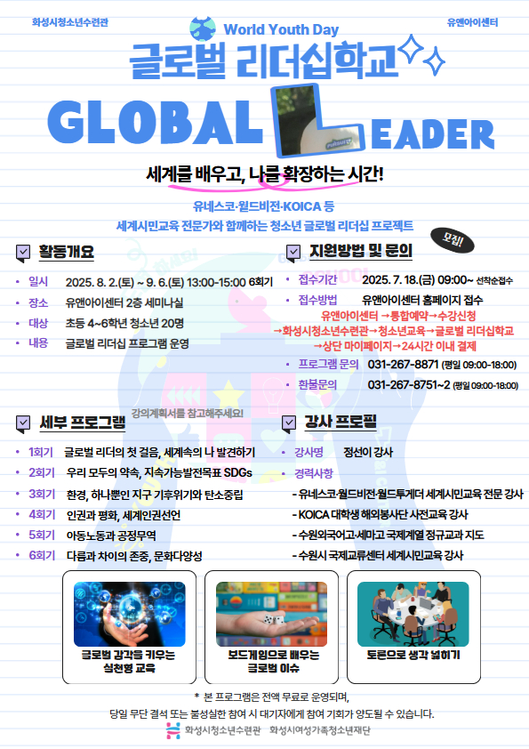 프로그램 안내 1) 활동안내 - 일시: 2025년 8. 2.(토) ~ 9. 6.(토) 13:00-15:00, 6회기 - 대상: 화성시 관내 초등 4~6학년 청소년 20명 - 장소: 유앤아이센터 2층 세미나실 - 내용: 글로벌 리더십 프로그램 운영 2) 신청방법 -참가비: 무료 -신청방법: 7월 18일 금요일 09:00~ 마감 시까지 선착순 접수 -신청방법: 화성시청소년수련관(유앤아이센터) 홈페이지 로그인 후 신청가능 [ 유앤아이센터 홈페이지 로그인 → 통합예약 → 수강신청 클릭 → (센터) 유앤아이센터 → (유형) 화성시청소년수련관 → (분류) 청소년교육 → 글로벌 리더십학교 ]