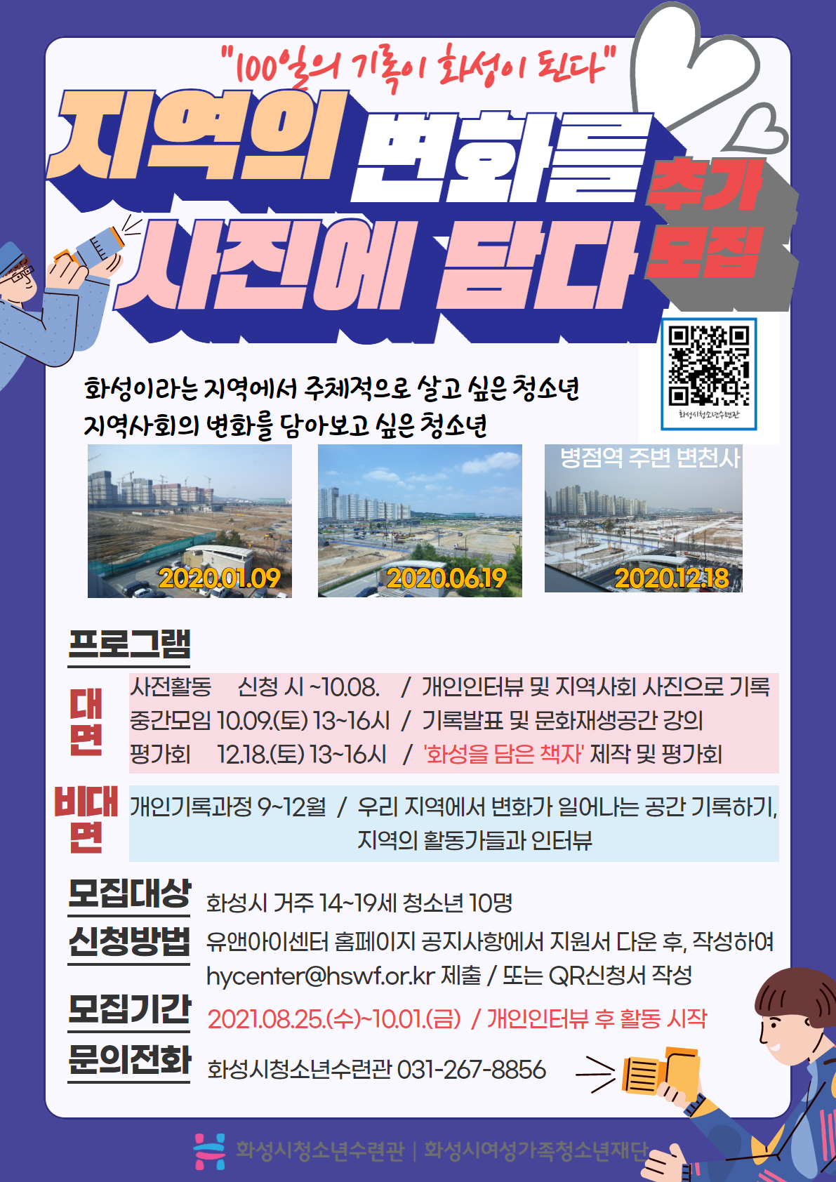 화성시청소년수련관 [지역의 변화를 사진에 담다] 1. 활동내용 ‘지역의 변화를 사진에 담다’ 프로그램은 청소년이 지역사회의 변화를 관찰하고 사진으로 기록하여 청소년이 자신이 둘러싼 환경의 변화가 개인의 삶에 어떤 영향을 주는지 관찰하며, 지역사회의 정주의식을 기르기 위한 프로그램입니다. 첫째, 이 프로그램은 청소년들의 지역사회 참여 프로그램으로 참가비가 없습니다. 둘째, 자신의 지역사회를 충분히 이해하는 시간을 가지며 100일의 프로젝트를 운영합니다. 지역사회 내 전시회 관람, 문화재생공간에 대한 강의, 지역 주민 인터뷰를 통해 지역사회를 이해하는 시간을 충분히 가집니다. 대면모임 3회와 비대면 개인기록과정을 통해 100일간 화성을 기록합니다. 셋째, 자신의 기록물을 결과물로 제작합니다. 본인이 직접 촬영한 사진을 기록하며 100일간 화성을 기록하며, 기록물과 인터뷰내용을 책자로 제작하며, 촬영 한 사진 중 선정하여 사진엽서등 굿즈로 제작하여 화성을 기록하고 결과물을 도출합니다. 2. 활동개요 - 대면 시 집합장소는 화성시청소년수련관(유앤아이센터)입니다. 코로나19로 인해 사회적거리두기에 따라 진행 상황이 변동될 수 있습니다. - 온라인 기록은 네이버 카페를 통해 업로드 진행 예정입니다. - 활동일시 및 내용