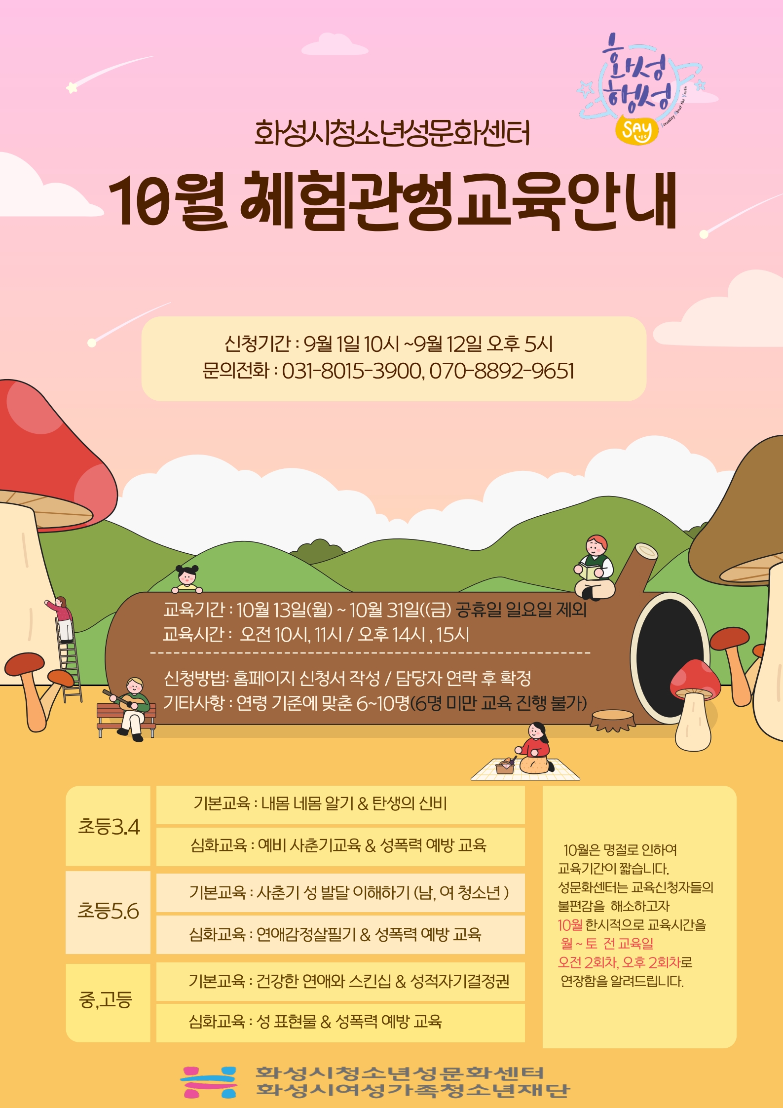 제목 [화성시청소년성문화센터]10월 체험관 신청(수정) 운영센터 화성시청소년성문화센터 작성일 2025년 9월 1일 9시 21분 조회수 605 첨부 파일 아이콘10월 체험관신청 포스터(수정)_1.jpg (956.11KB)다운로드 아이콘 목록보기