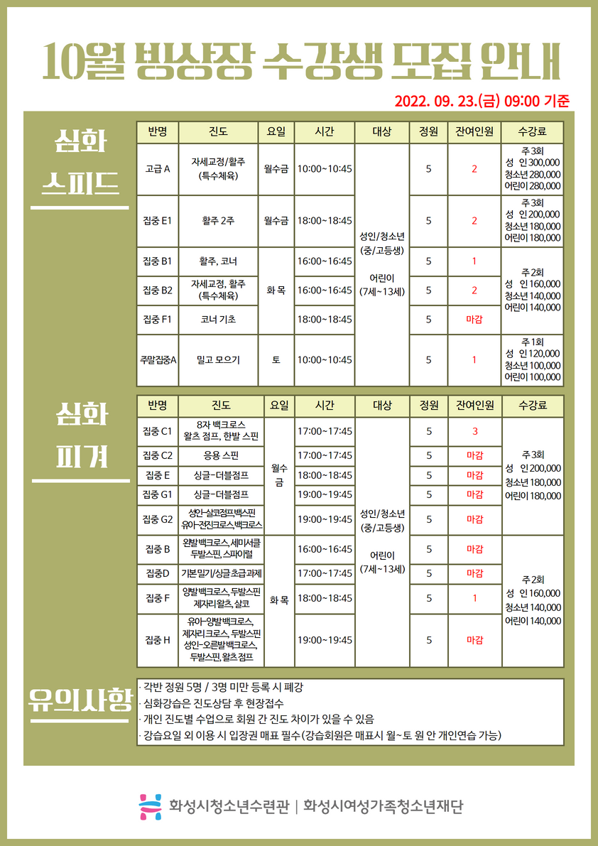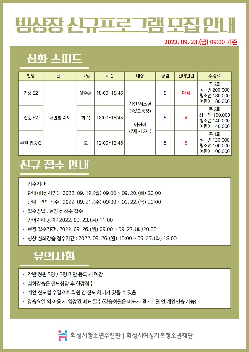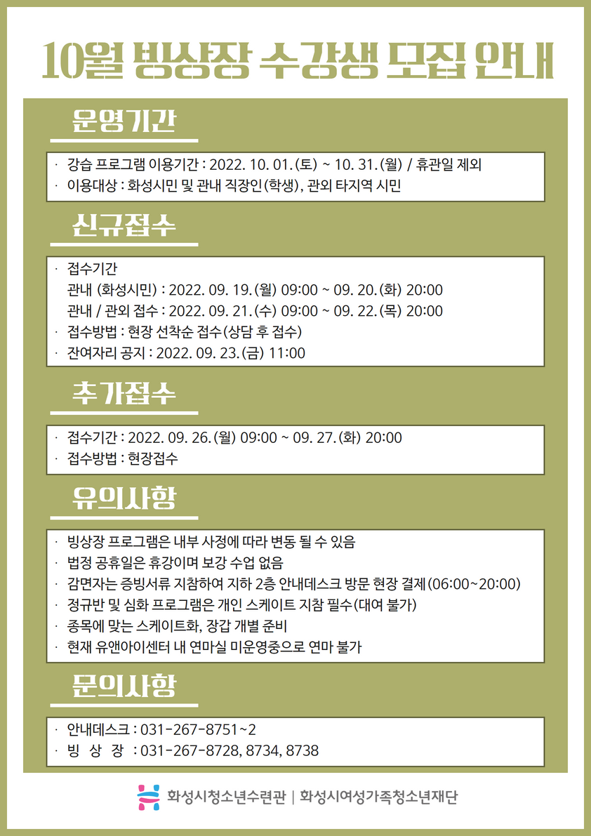| 제목 | [화성시청소년수련관] 10월 빙상장 신규 및 추가모집 잔여인원 안내 (2022. 09. 23. 11:00 기준) | ||