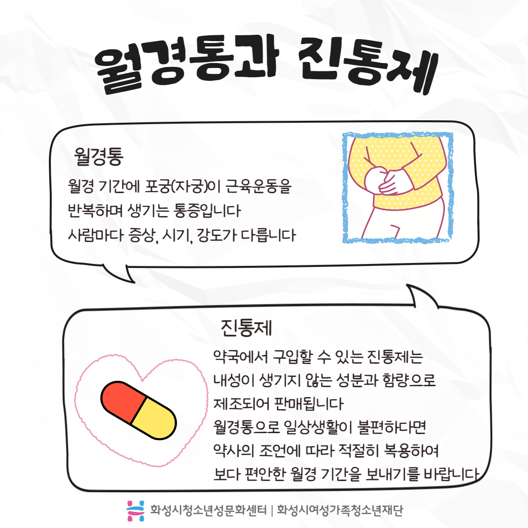#6 월경통과 진통제 월경통 월경 기간에 포궁(자궁)이 근육운동을 반복하며 생기는 통증입니다 사람마다 증상, 시기, 강도가 다릅니다 진통제 약국에서 구입할 수 있는 진통제는 내성이 생기지 않는 성분과 함량으로 제조되어 판매됩니다 월경통으로 일상생활이 불편하다면 약사의 조언에 따라 적절히 복용하여 보다 편안한 월경 기간을 보내기를 바랍니다