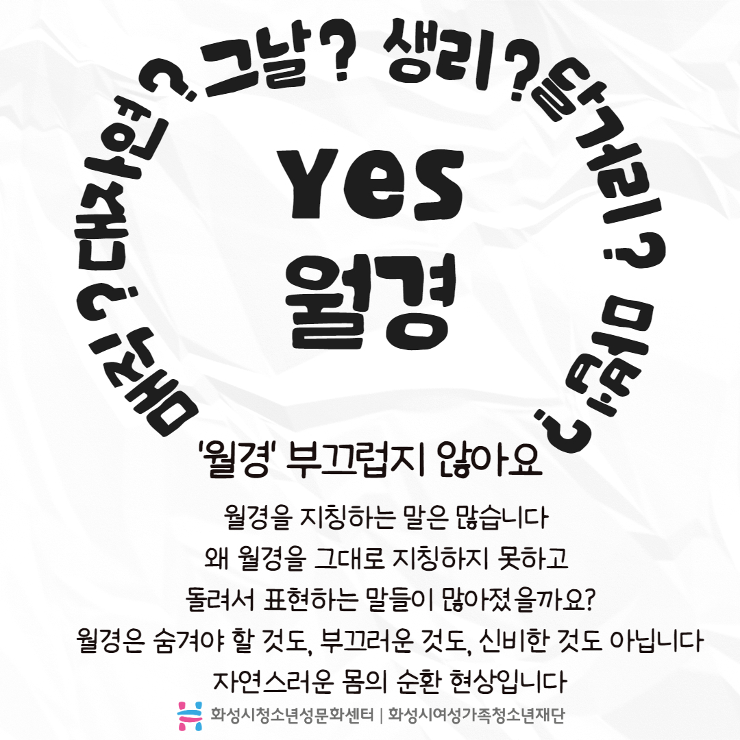 #3 Yes 월경 매직? 대자연? 그날? 생리? 달거리? 마법? '월경' 부끄럽지 않아요 월경을 지칭하는 말은 많습니다 왜 월경을 그대로 지칭하지 못하고 돌려서 표현하는 말들이 많아졌을까요? 월경은 숨겨야 할 것도, 부끄러운 것도, 신비한 것도 아닙니다 자연스러운 몸의 순환 현상입니다