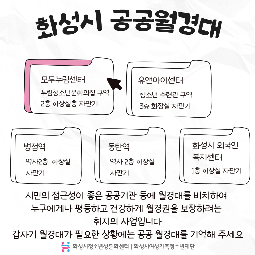 #7 화성시 공공월경대 모두누림센터 누림청소년문화의집 구역 2층 화장실층 자판기 유앤아이센터 청소년 수련관 구역 3층 화장실 자판기 병점역 역사2층 화장실 자판기 동탄역 역사 2층 화장실 자판기 화성시 외국인 복지센터 1층 화장실 자판기 시민의 접근성이 좋은 공공기관 등에 월경대를 비치하여 누구에게나 평등하고 건강하게 월경권을 보장하려는 취지의 사업입니다 갑자기 월경대가 필요한 상황에는 공공 월경대를 기억해 주세요
