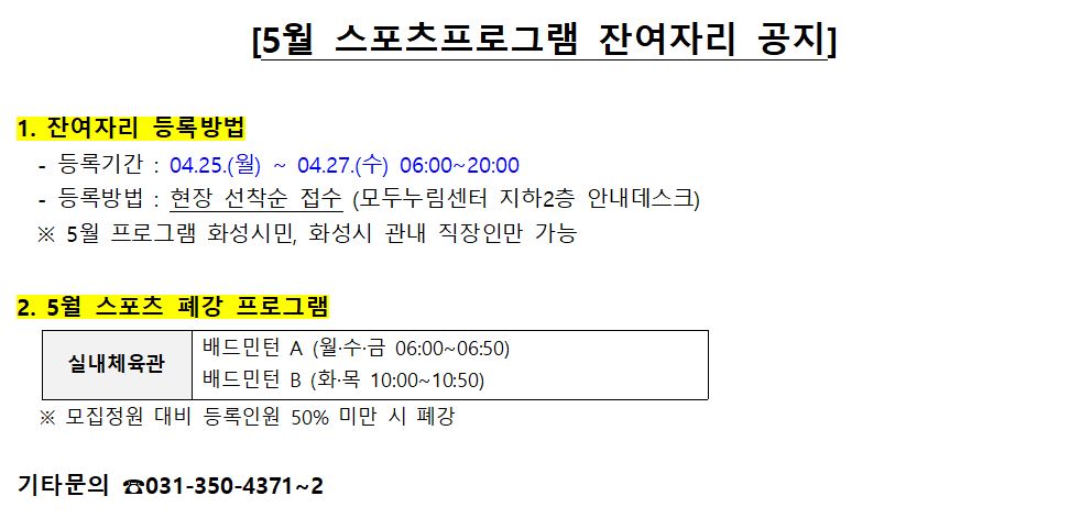 제목 [모두누림센터] 5월 스포츠프로그램 잔여자리 공지(04.23. 14:00 기준) 운영센터 모두누림센터 작성일 2022년 4월 23일 13시 51분 조회수 1,966 첨부 파일 아이콘5월 잔여자리 공지(04.23).pdf (73.2KB)다운로드 아이콘 목록보기