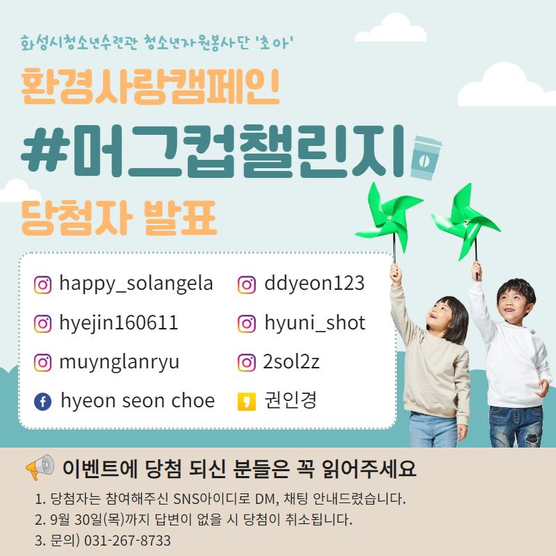 제목 [화성시청소년수련관] 청소년자원봉사단 환경사랑캠페인 ★머그컵챌린지 이벤트 당첨자 발표★ 운영센터 유앤아이센터 작성일 2021년 9월 28일 11시 37분 조회수 1,367 목록보기