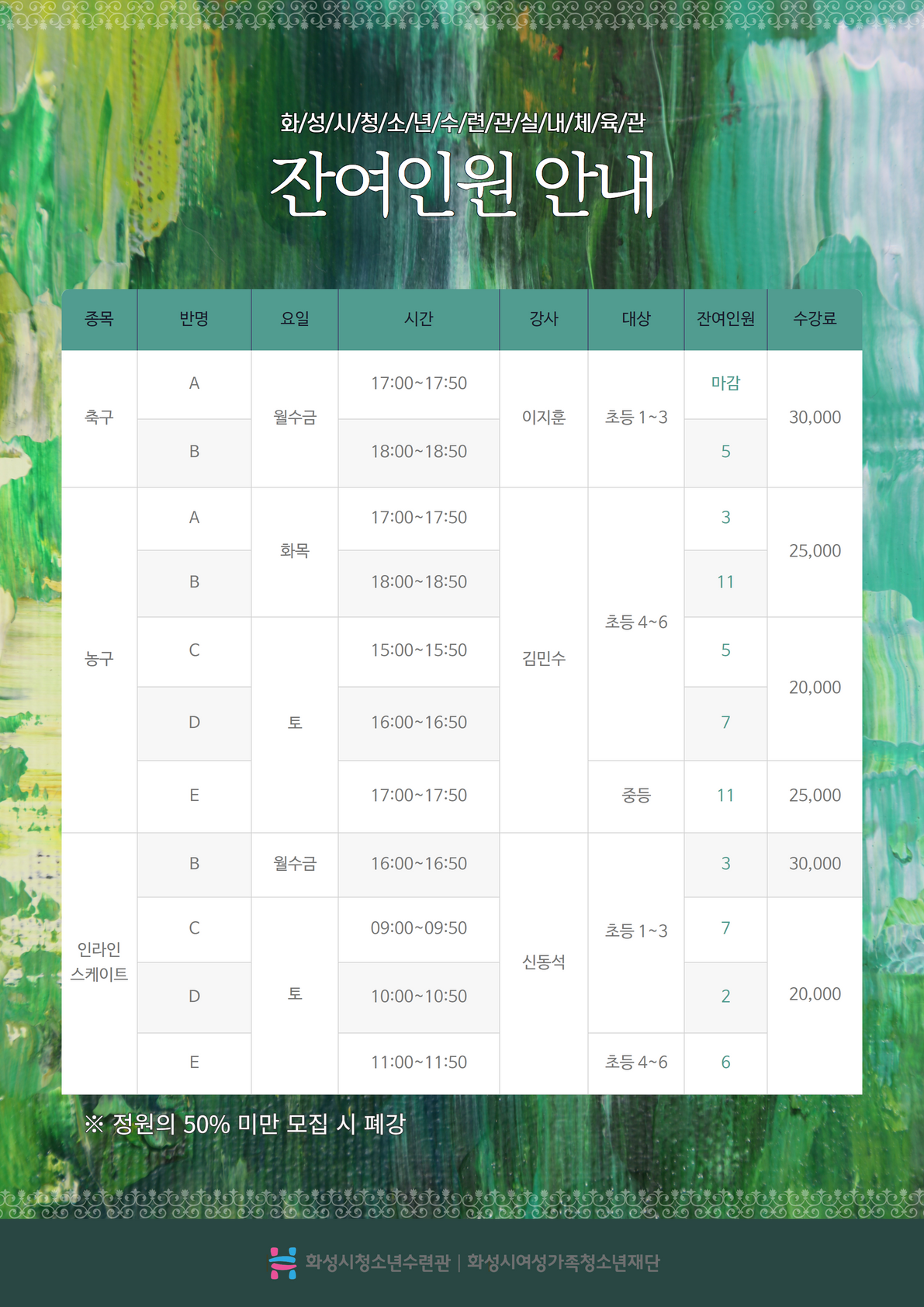 | 제목 | [화성시청소년수련관] 8월 실내체육관 프로그램 기존반 추가접수 안내 | ||