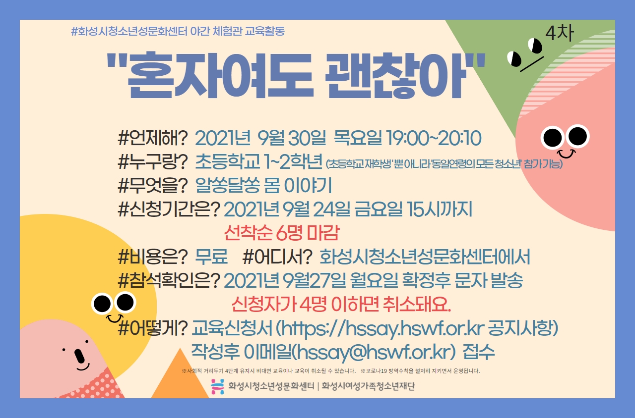 제목 [화성시청소년성문화센터] "혼자여도 괜찮아" - 2021년 9월 30일(목요일) 참가자 모집 운영센터 화성시청소년성문화센터 작성일 2021년 9월 9일 16시 32분 조회수 1,212 첨부 파일 아이콘2021년9월혼자여도 괜찮아 참가신청서양식.hwp (84KB)다운로드 아이콘 목록보기