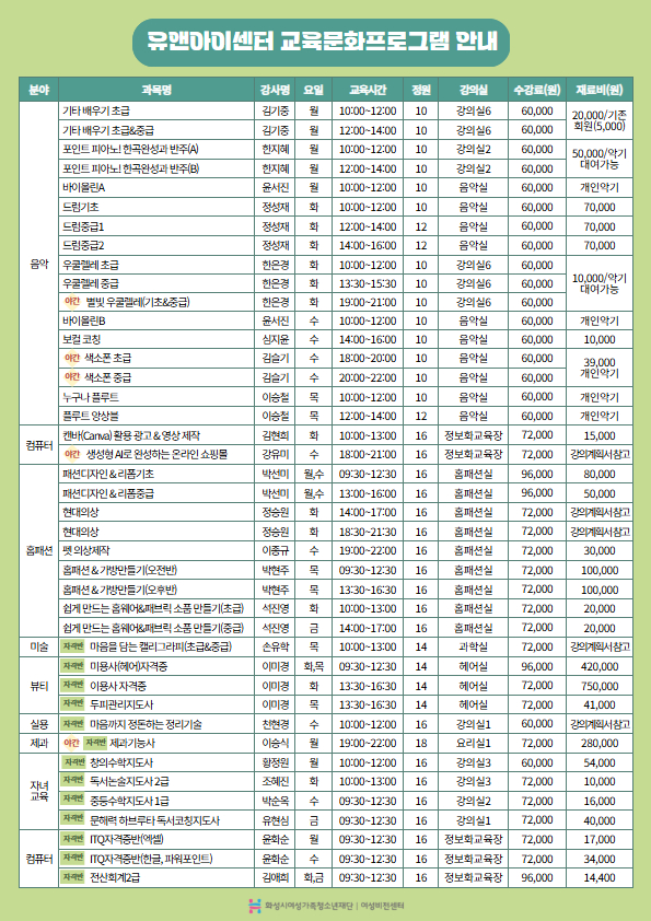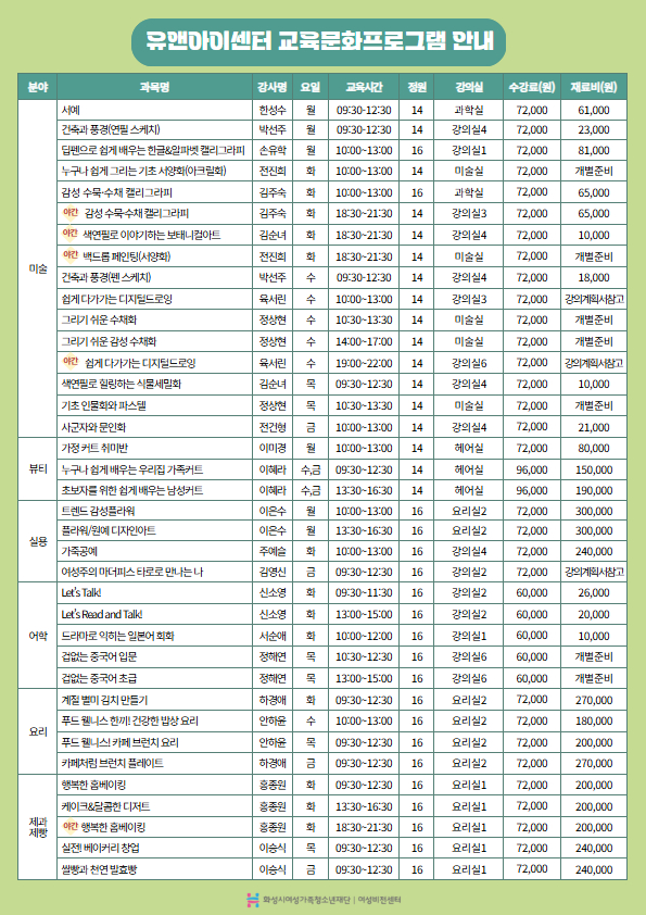 | 제목 | [화성시여성비전센터] 2026년 1학기 유앤아이센터 교육 프로그램 수강생 모집(26. 1. 5.~1. 20.) | |||||||||||||||||||||||||||||