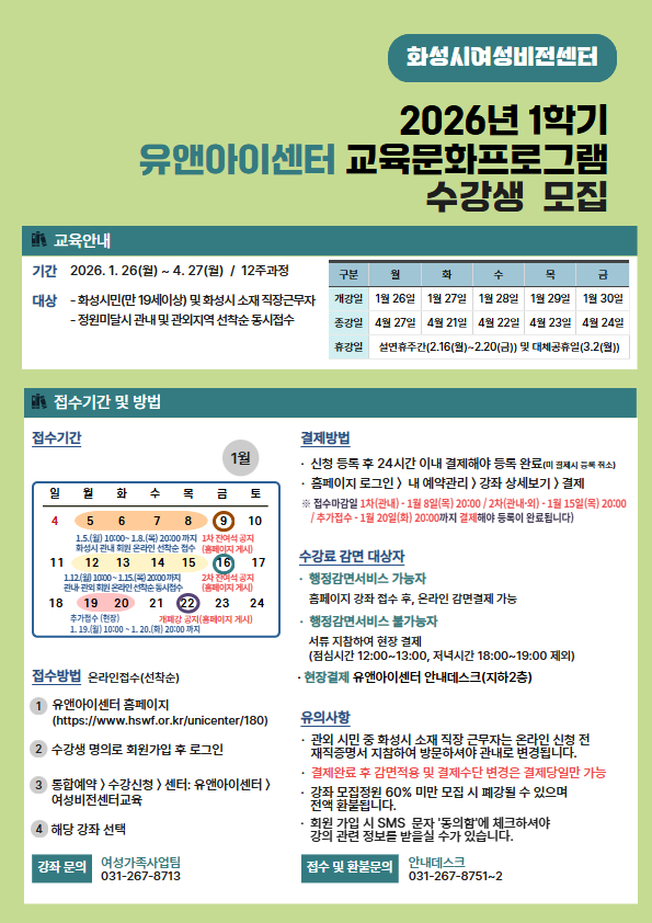 □ 신청방법(온라인) ☞유앤아이센터 홈페이지 로그인→ 통합예약 → 강좌선택 → 수강신청 □ 결제방법 유앤아이센터 홈페이지 로그인 → 내 예약관리 -> 결제 ※ 본인 이름으로 회원가입하여 수강 신청후 24시간 이내 결제해야 등록 완료! (접수마감일 1차: 1월8일(목) / 2차: 1월15일(목) / 추가접수: 1월20일(화)은 20:00시까지 결재해야 등록이 완료) □ 감면대상자 제출방법(신분증 지참) 감면대상자는 온라인 수강신청 후 감면서류 지참하여 24시간 이내 현장 결제 ※ 단, 등록장애인, 국가유공자, 국민기초생활수급자, 차상위계층, 경로할인은 인터넷 접수시 행정감면서비스 조회를 통해 자동감면 적용 ※ 관외 시민 중 화성시 소재 직장 근무자는 온라인 신청 전 재직증명서 지참 후 방문 ※유앤아이센터 지하2층 안내데스크 → 평일(10:00~20:00) 점심시간(12:00~13:00)제외, 저녁시간(16:30~17:30)제외 □ 문의: 접수(031-267-8751~2) 교육(031-267-8713) (점심시간 12:00~13:00, 저녁시간18:00~19:00 제외, 주말 및 공휴일 제외)
