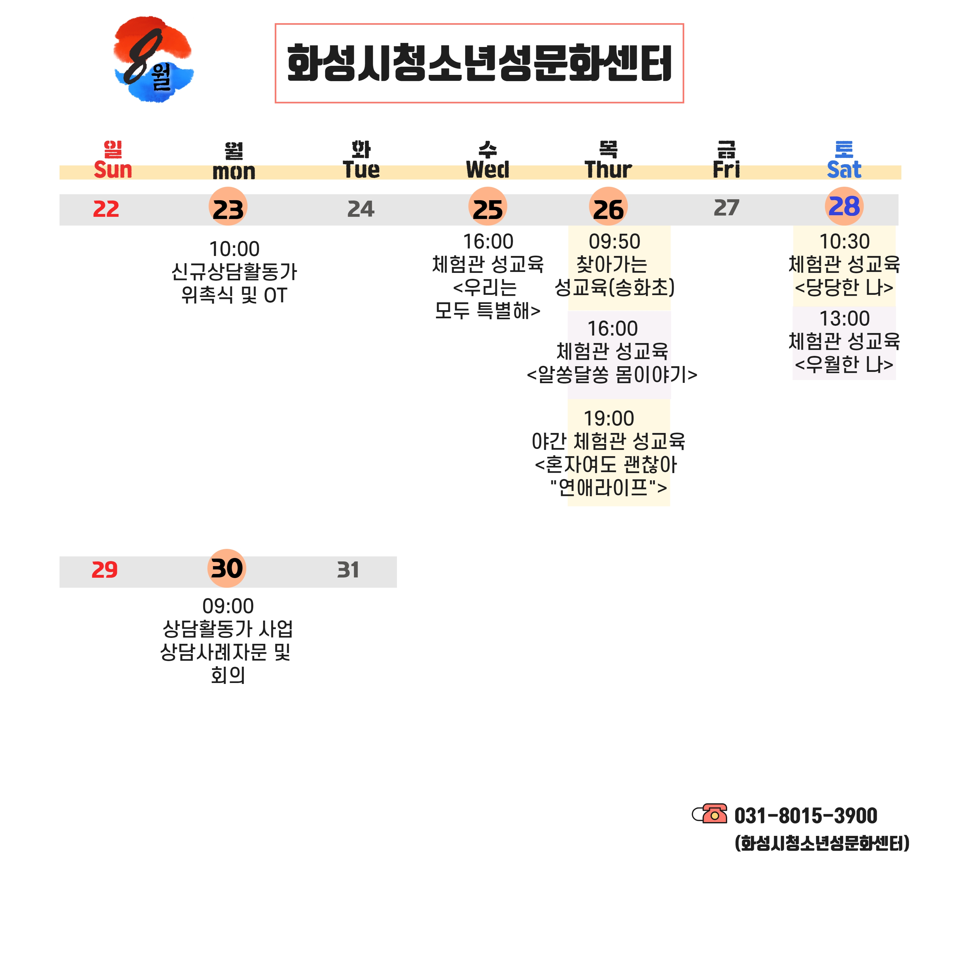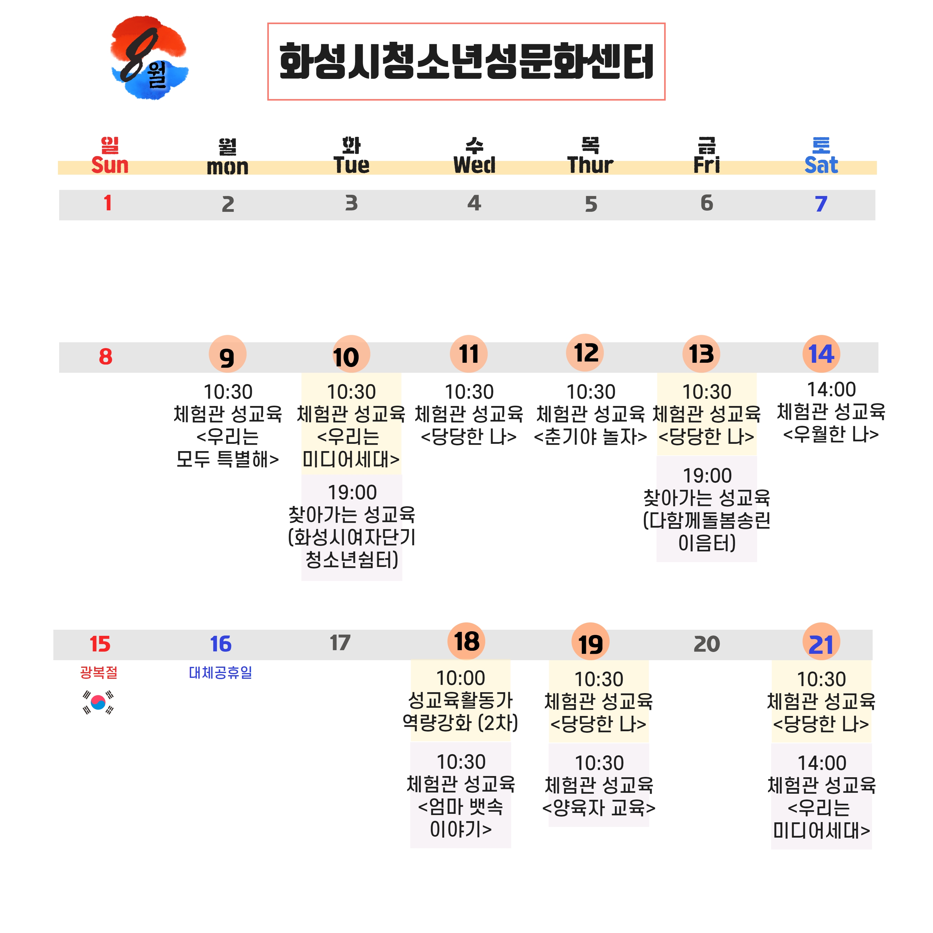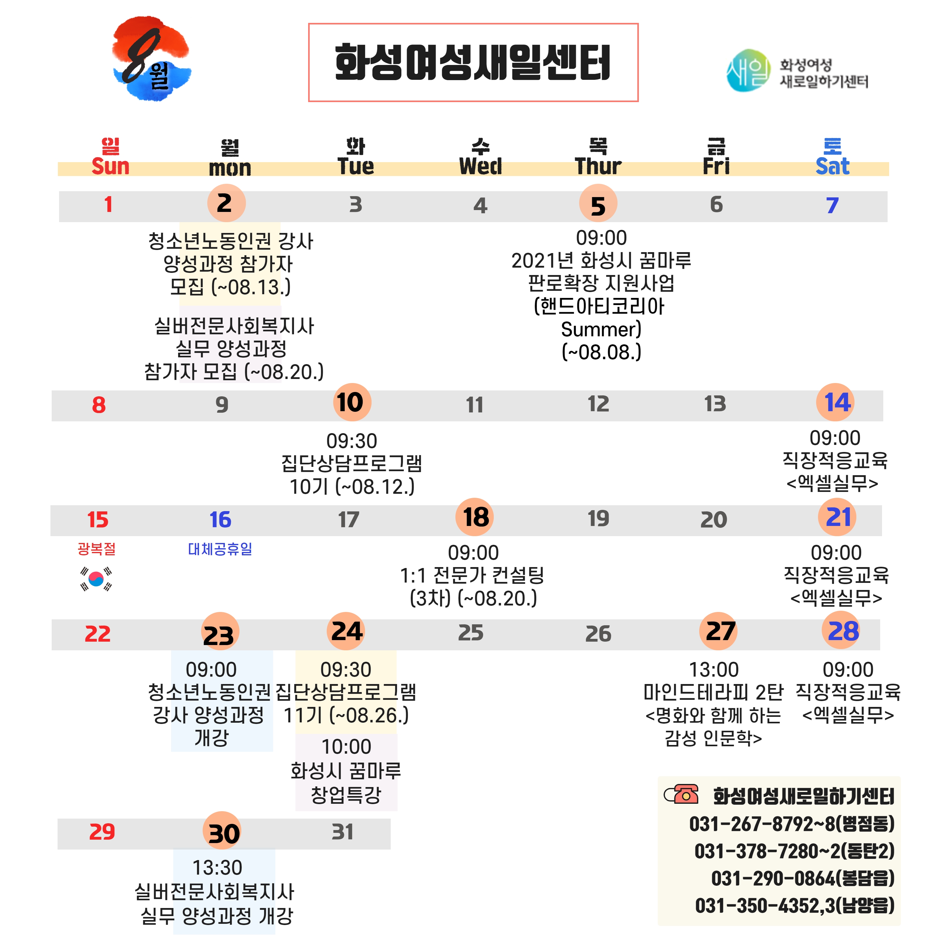 안녕하세요. 화성시여성가족청소년재단의 8월 일정을 안내해드립니다.