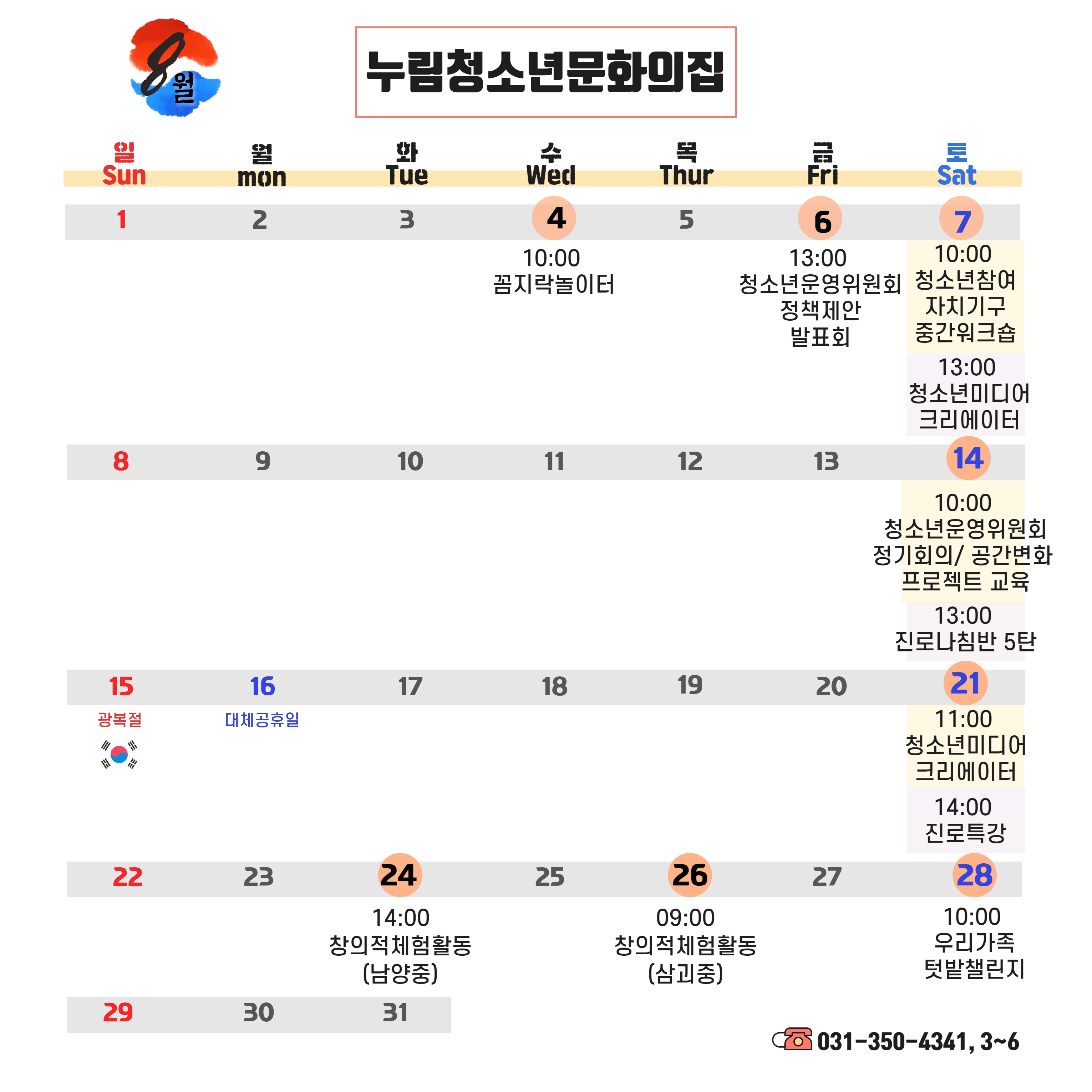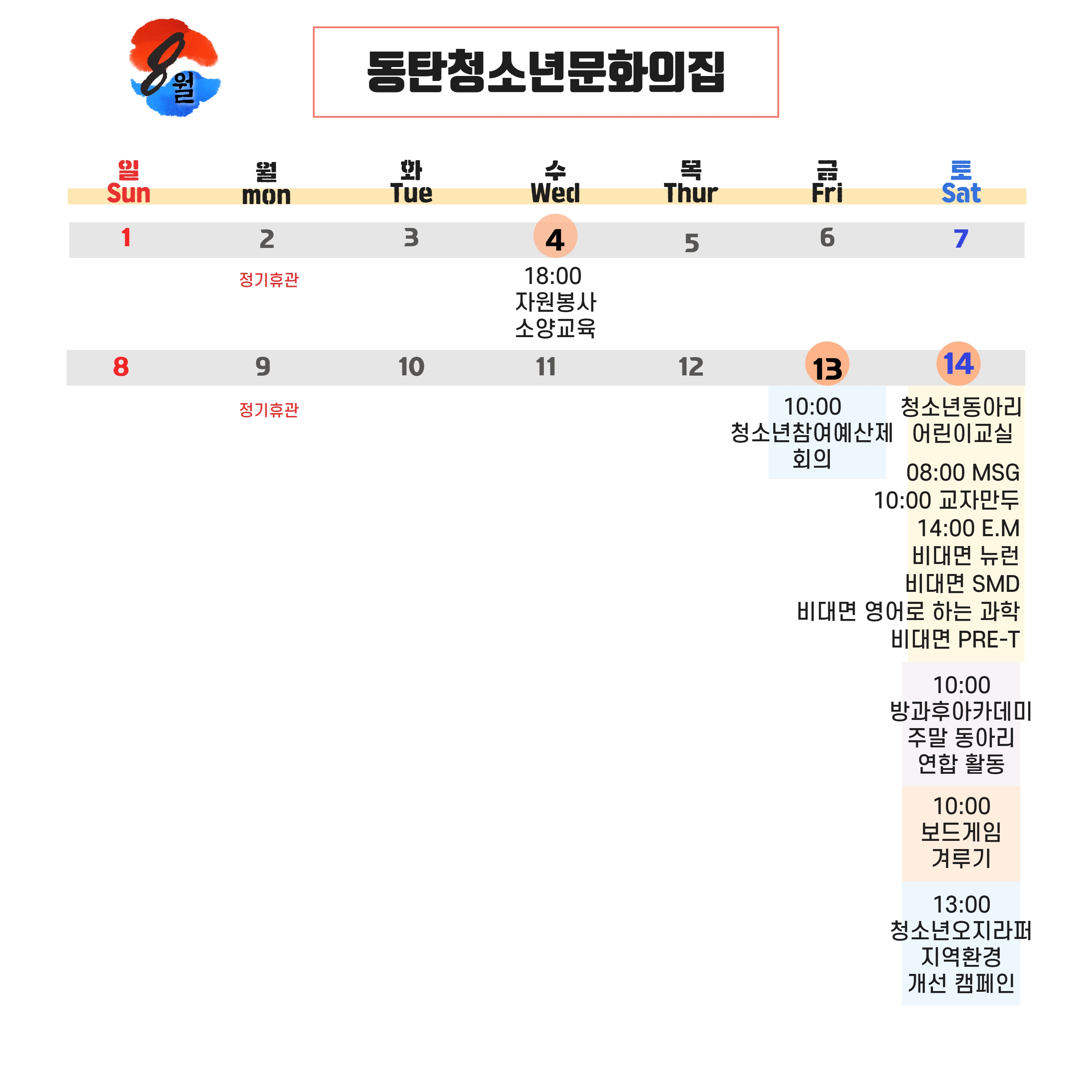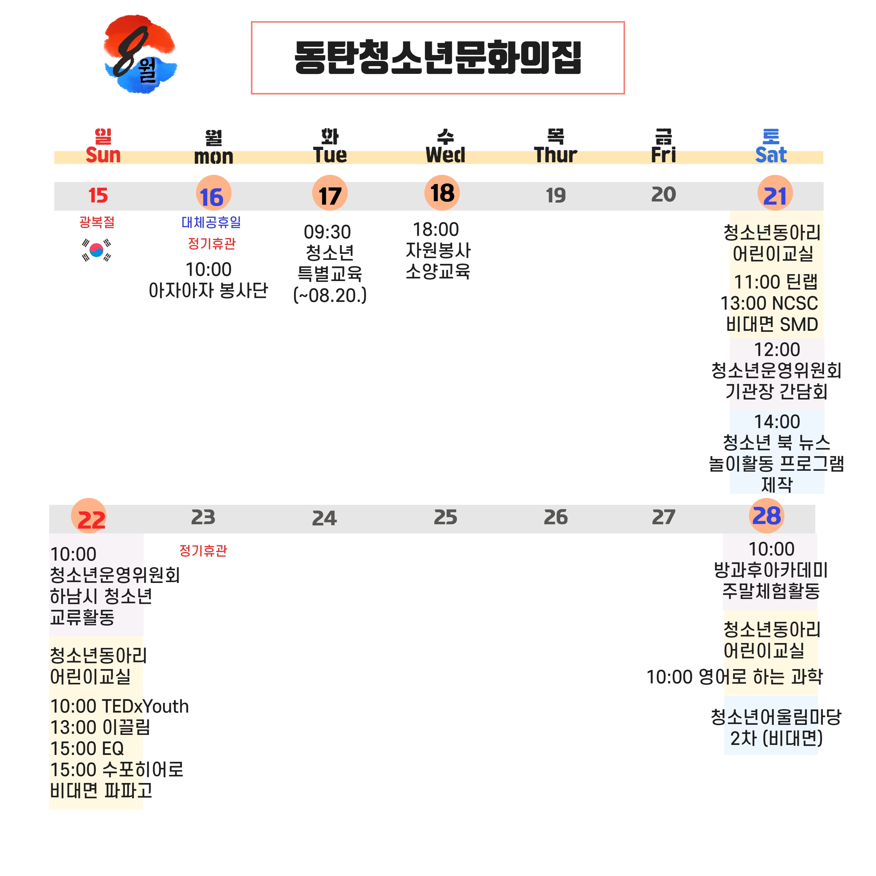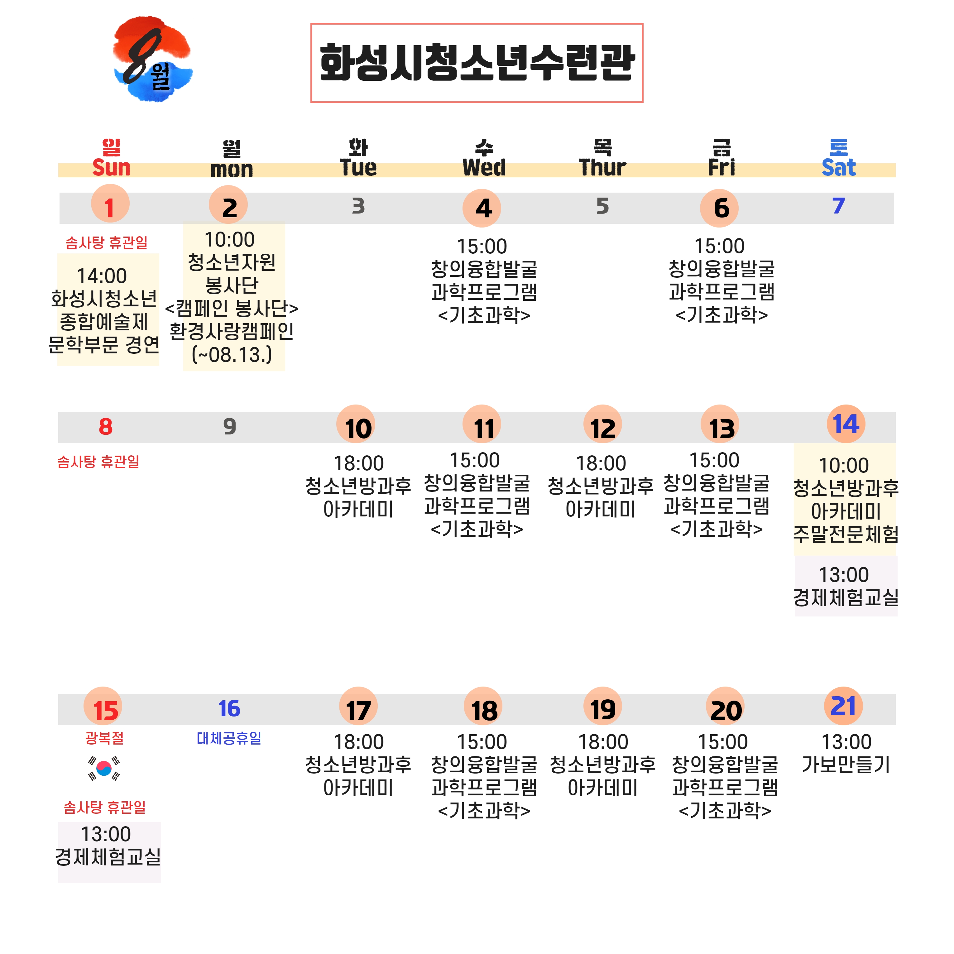 안녕하세요. 화성시여성가족청소년재단의 8월 일정을 안내해드립니다.