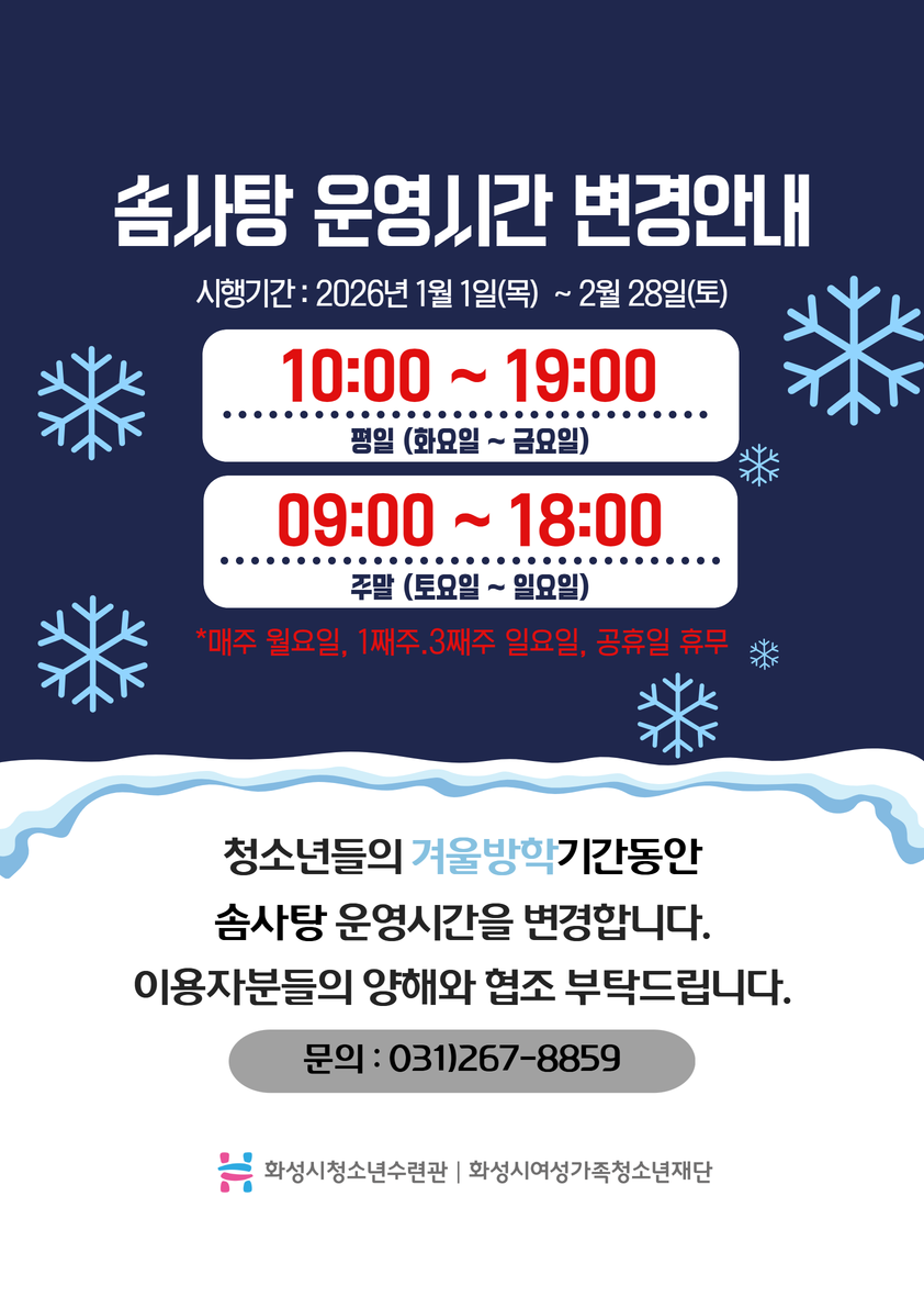 청소년자율이용공간(솜사탕) 겨울방학 운영시간 변경 안내 1) 변경운영기간 - 2026. 1. 1.(목)~2. 28.(토) [59일간] 2) 변경운영시간 -평일(화~금요일): 10:00~19:00로 변경 -주말(토~일요일): 09:00~18:00 동일 -휴관 안내:매주 월요일, 1째주.3째주 일요일, 공휴일 휴무 문의사항 031-267-8859