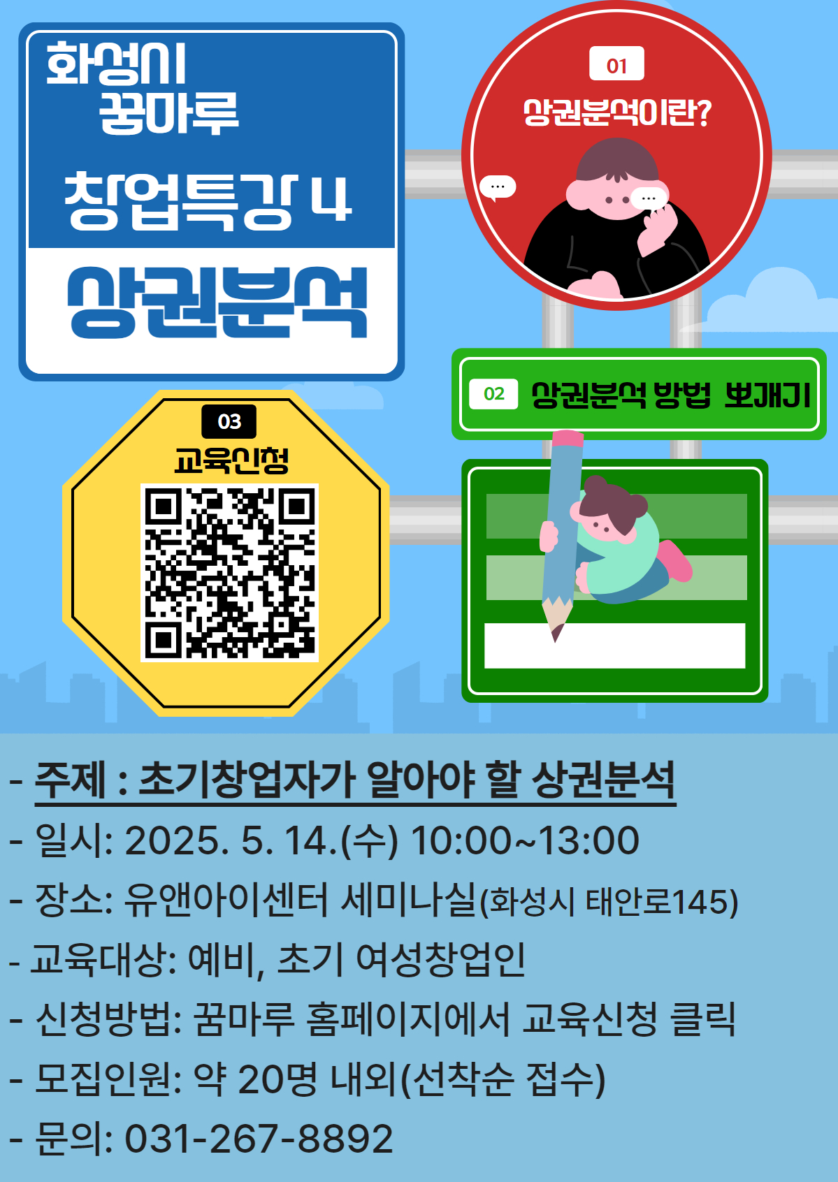 [화성시꿈마루] 2025년 창업특강 4탄. 초기창업자가 알아야 할 상권분석 교육 신청자 모집 화성시꿈마루가 준비한 2025년 창업특강 4탄 상권분석!!! 나에게 맞는 상권 찾기가 어려우신가요? 창업아이템별 상권 찾는 방법을 알기 쉽게 알려드립니다. 1. 모집개요 -교육명: 초기창업자가 알아야 할 상권분석 -일 시: 2025. 5. 14.(수) 10:00~13:00 (총3시간) -대 상: 화성시 꿈마루 회원 (예비 및 초기 창업자) -교육장소: 유앤아이센터 2층 세미나실 (화성시 태안로 145) -교육비: 수강료 전액 지원 (무료) -모집인원: 25명 내외(홈페이지 선착순 접수) -접수기간: 2025. 4. 14.(월) ~ 모집완료시까지 2. 교육커리큘럼 - 상권분석 방법 - 창업아이템별 상권 특징 *문의: 031-267-8892 |