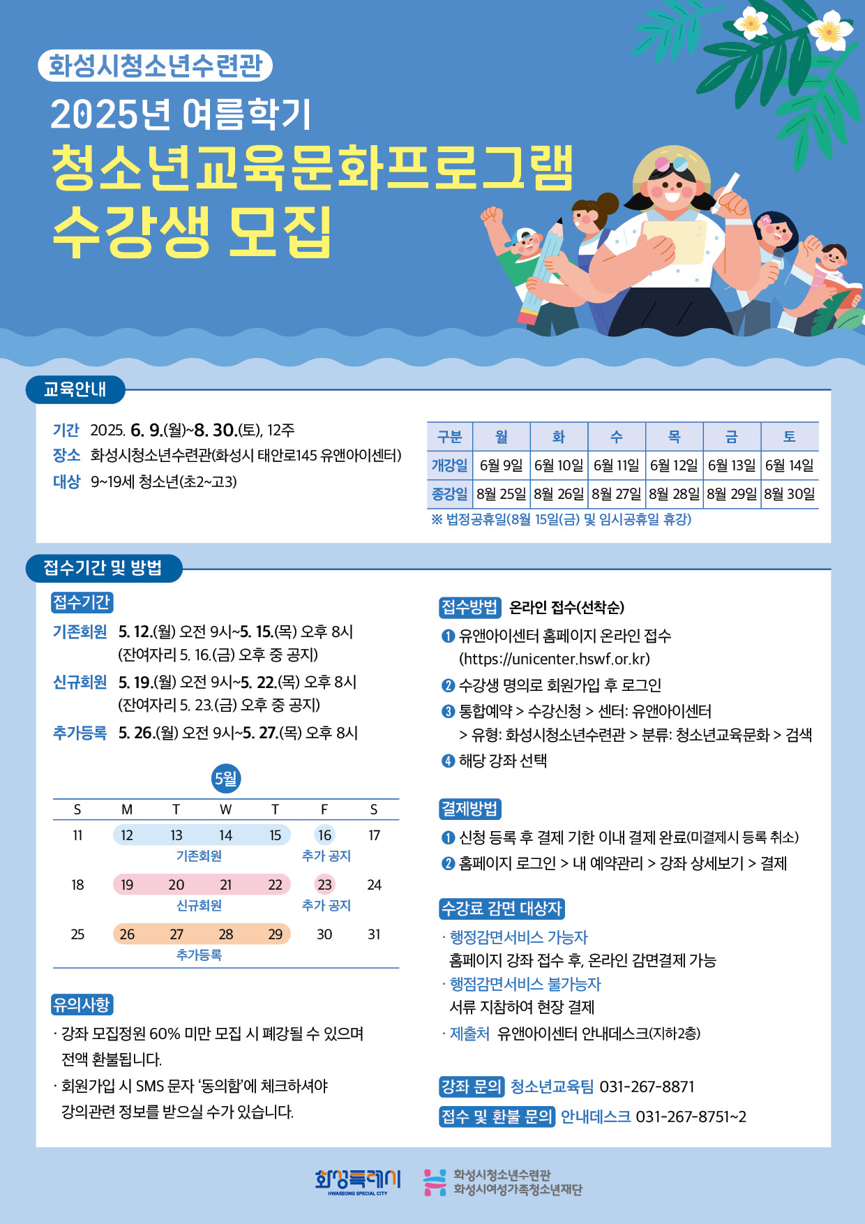 □ 교육기간: 2025. 6. 9.(월)~ 8. 30.(토) [12주 과정] ※ 법정 공휴일 및 정부지침에서 지정한 대체공휴일, 임시공휴일은 휴강이며, 보강하지 않음. (8/15(금) 광복절) ※ 화성시주최행사 및 재단사정에 의해 교육일정 변경이 있을 수 있습니다. □ 교육대상: 9~19세 청소년(초2~고3) □ 모집강좌: 28강좌/ 239명 □ 접수일정 - 기존회원 접수: 5. 12.(월) ~ 5. 15.(목) * 5. 16.(금) 잔여자리 공지 - 신규회원 접수: 5. 19.(월) ~ 5. 22.(목) * 5. 23.(금) 잔여자리 공지 - 추가접수: 5. 26.(월) ~ 5. 29.(목) ※ 사전에 회원가입 부탁드립니다. □ 문의 : 강좌문의 031-267-8871 접수 및 환불문의 031-267-8751~2 (점심시간 12:00~13:00, 저녁시간 18:00~19:00제외, 주말 및 공휴일 제외) □ 자세한 사항은 아래 팜플렛 확인바랍니다