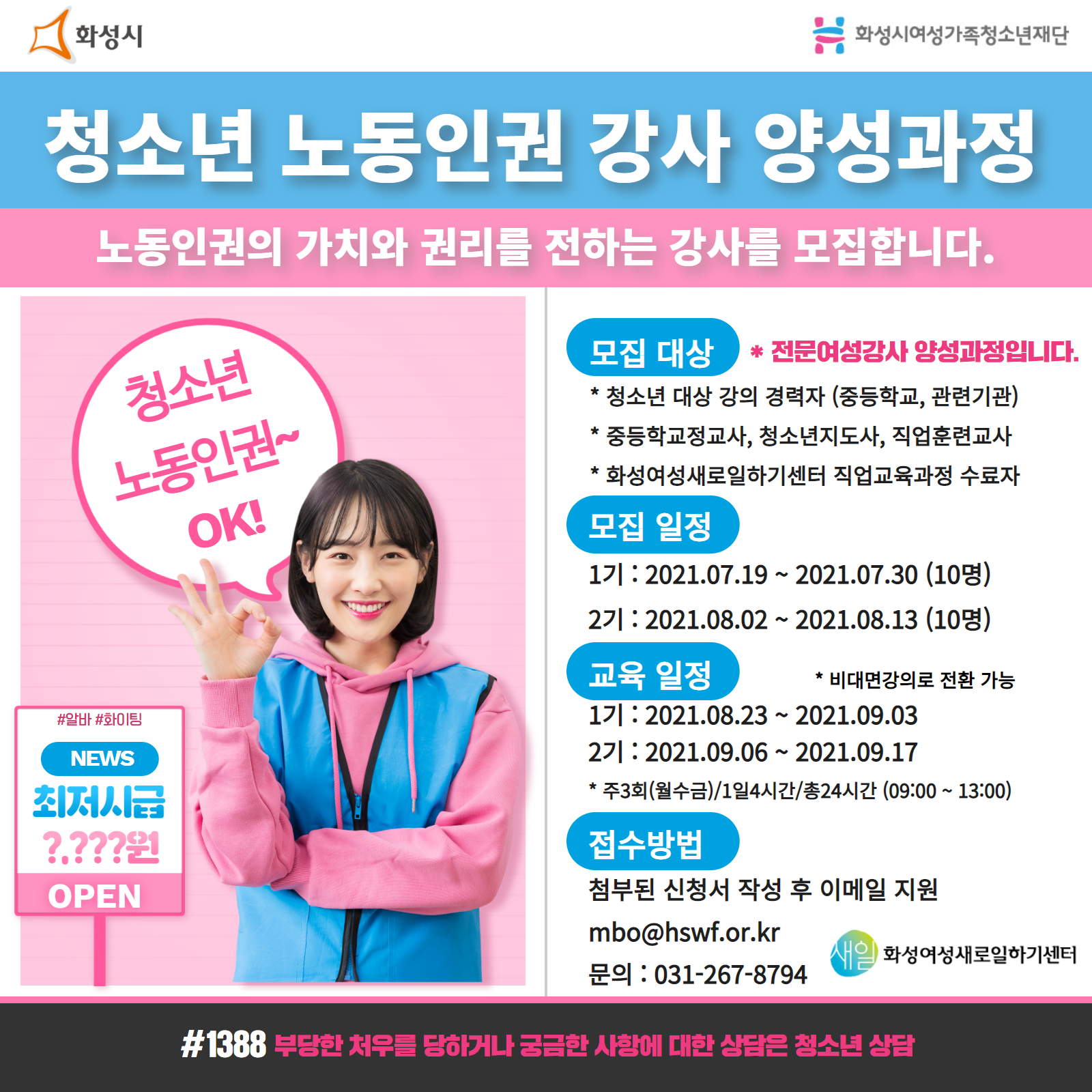 | 제목 | [화성여성새로일하기센터] 청소년 노동인권 강사 양성과정 교육생모집 | ||