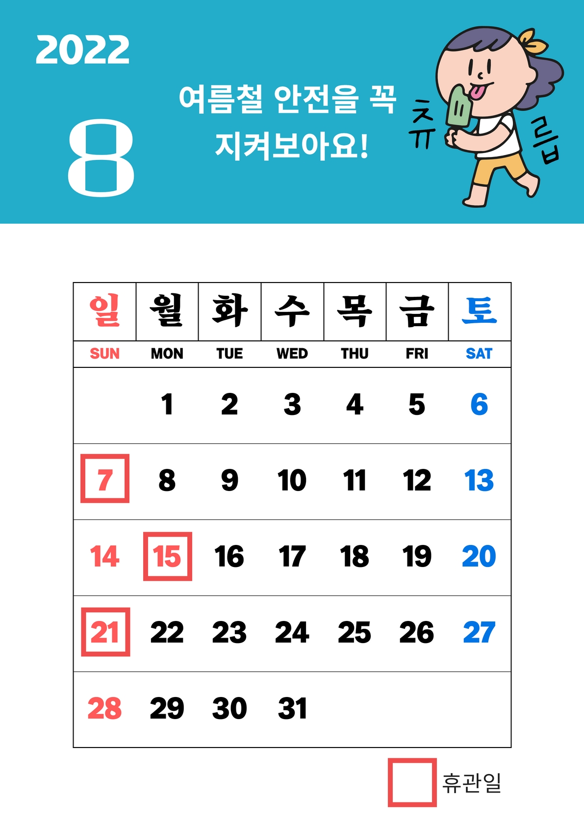 제목 [누림청소년문화의집] 8월 자율이용공간 휴관 안내 운영센터 모두누림센터 작성일 2022년 7월 26일 10시 5분 조회수 1,141 안녕하세요 누림청소년문화의집 입니다. 8월 자율이용공간 안내를 드리오니 확인 후 방문해주시기 바랍니다. 목록보기