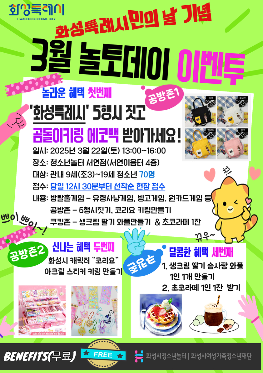 [청소년놀터 서연점] 3월 “화성특례시민의 날 기념” 놀토데이 참가자 모집 일시: 2025. 3. 22.(토) 13시~16시 장소: 청소년놀터 서연점 대상: 초등3학년~19세 청소년 당일 선착순 70명 접수: 당일 12시 30분부터~ 현장 접수 내용: 방탈출게임, 5행시짓기, 코리요 키링 만들기 생크림 딸기 솜사탕 와플만들기 & 초코 라떼 등