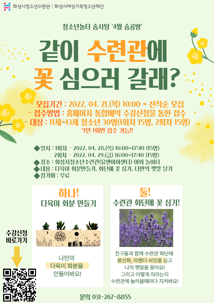 - 운영일시 : 04.28.(목) 16:00~17:40 (15명), 04.29.(금) 16:00~17:40 (15명) - 장소 : 화성시청소년수련관(유앤아이센터) 야외 놀이터 - 내용 : 다육이 화분만들기, 수련관 화단에 함께 꽃심기, 나만의 팻말 만들어 달기 ??- 참가비 : 무료!