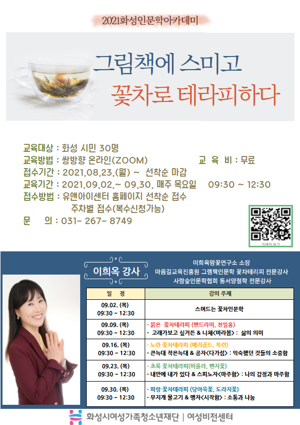제목 [화성시여성비전센터] 화성인문학아카데미 "그림책에 스미고, 꽃차로 테라피하다." 안내 운영센터 유앤아이센터 작성일 2021년 8월 17일 11시 22분 조회수 1,727 수강신청 바로가기 ☞ https://www.hswf.or.kr/fmcs/116 ? 목록보기