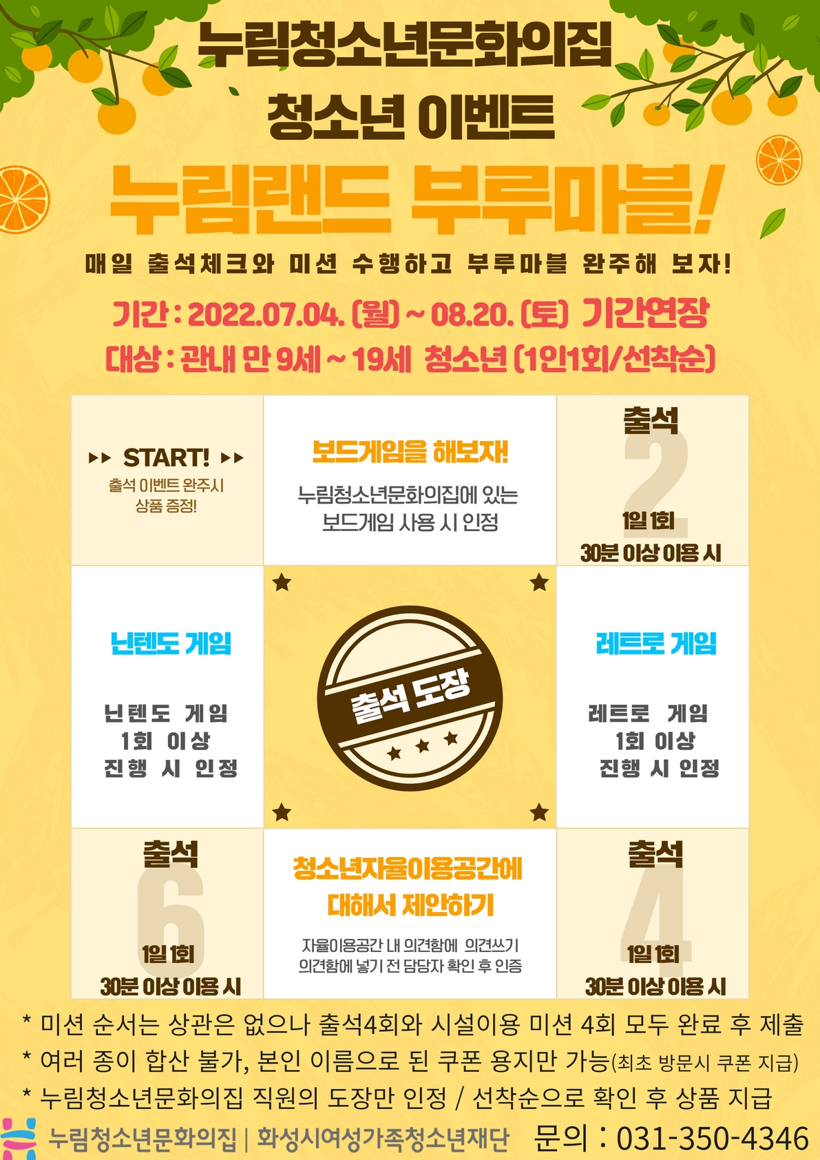 제목 [누림청소년문화의집] 참여이벤트'누림랜드 부루마블' 참여 기간 연장 운영센터 모두누림센터 작성일 2022년 7월 25일 10시 21분 조회수 1,184 안녕하세요 누림청소년문화의집입니다. 기존에 진행하던 참여이벤트'누림랜드 부루마블' 참여기간을 연장합니다. 8월 20일까지 기간을 연장하오니 많은 관심과 참여 바랍니다. 목록보기
