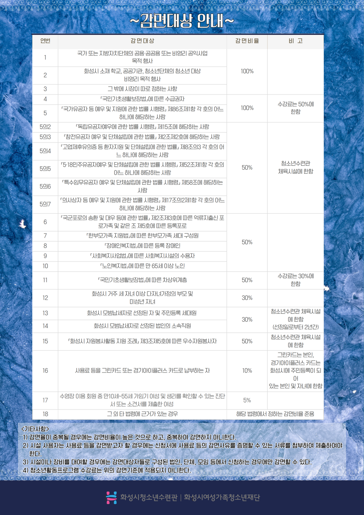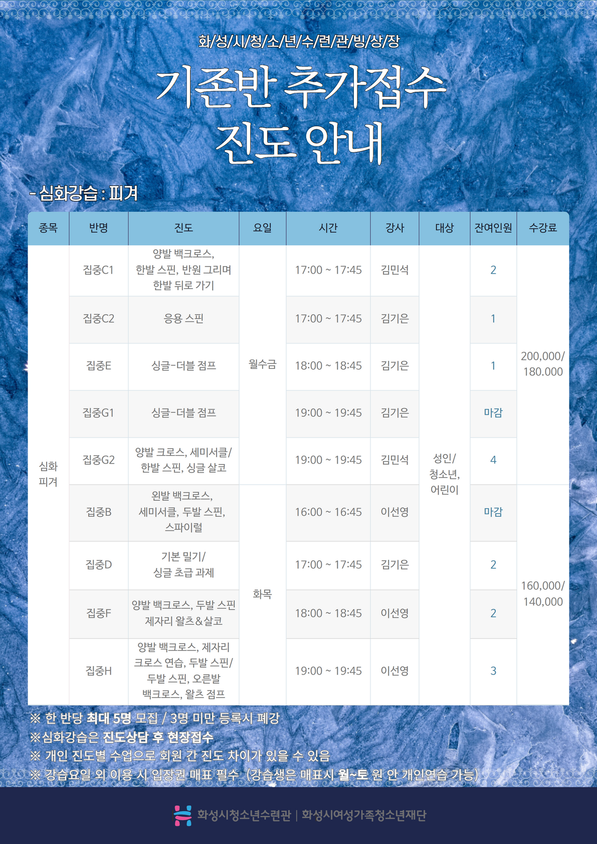 | 제목 | [화성시청소년수련관] 9월 빙상장 신규 및 추가모집 잔여인원 안내 (22.08.24. 14:00 기준) | ||