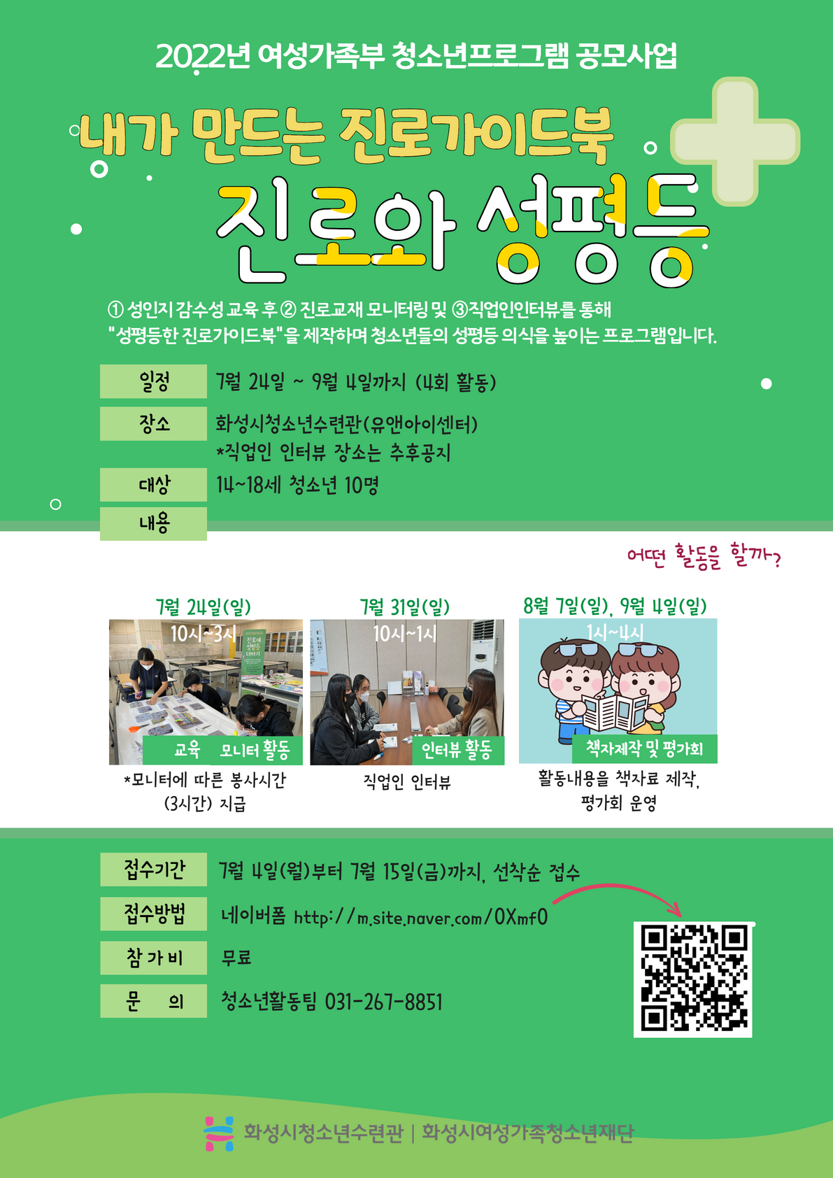 14~18세의 청소년이라면 주목해주세요 :) 화성시청소년수련관에서는 2022년 여성가족부 청소년프로그램 공모사업으로 선정된 우수 프로그램으로 “진로에 성평등 더하기” 라는 주제로 진행되며, 참가할 청소년을 모집하고 있습니다. 이 프로그램을 소개하자면!!! 1. 전문가의 컨설팅을 통해 기획된 성평등 의식제고 프로그램 여성가족부 청소년프로그램 공모사업에 선정되어 운영되는 프로그램입니다. 청소년의 성평등 의식제고를 위해 기획된 프로그램으로 선정 후에 전문가의 전문 컨설팅이 반영된 내용으로 구성되었습니다. 2. 성인지감수성 UP! 진로역량도 UP! 교육을 통해 성인지감수성을 높이고, 성차별을 극복하거나, 새로운 분야를 개척한 직업인의 인터뷰를 진행하여 진로역량도 키울 수 있습니다. 3. 활동혜택! 첫째, 이 모든 활동은 참가비없이 무료로 진행됩니다. 둘째, 모니터 활동에 따른 봉사시간이 지급됩니다.(최대 3시간) 셋째, 활동에 따른 내용을 결과물로 제작하여 책자가 배부됩니다.