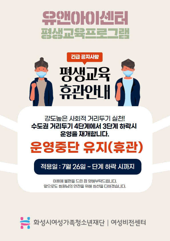 [화성시여성비전센터] 2021년도 2학기(31기) 평생교육 프로그램 휴관안내