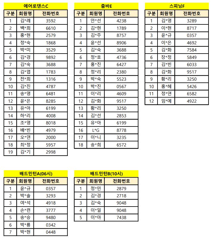 3. 5월 신규 스포츠프로그램 폐강 안내(정원 50% 미만) 9강좌 가. GX : 바디웨이트 나. 실내체육관: 배드민턴A-1(월수금 07시), 배드민턴A-2(화목 06시, 화목 07시) 배드민턴B(월수금 09시, 월수금 11시), 방과후 배드민턴 다. 스피닝: 스피닝C, 스피닝D