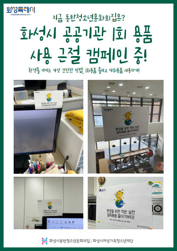 지금 동탄청소년문화의집은 1회 용품 사용을 줄이고 다회용품을 사용하자는 포스터를 제작하여 다양한 곳에 부착하여 캠페인 중입니다!