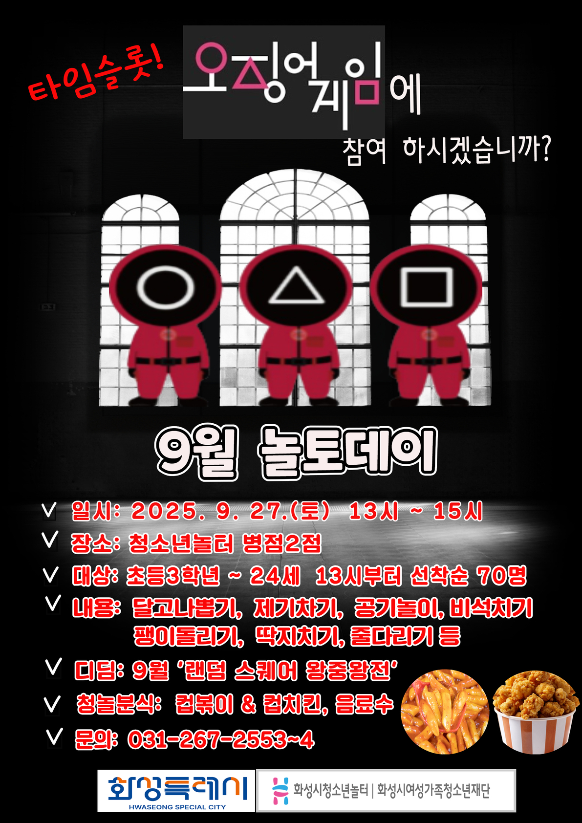 [청소년놀터 병점2점] 9월 놀토데이 '타임슬롯! 오징어게임’ 참가자 모집 재단에 바랍니다 상세 등록일 2025년 9월 9일 15시 40분 조회수 82 파일 아이콘9월 놀토데이.jpg (1.2MB)다운로드 아이콘 목록보기
