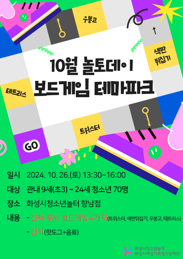 [청소년놀터 향남점] 10월 놀토데이 "보드게임 테마파크" 참가자 모집 인내 재단에 바랍니다 상세 등록일 2024년 10월 16일 14시 26분 조회수 267 안녕하세요. 청소년놀터 향남점입니다!10월 놀토데이 - 보드게임 테마파크 참가자 모집 안내 드립니다.일시: 2024. 10. 26. (토) 13:30 ~ 16:00대상: 관내 9세(초3) ~ 24세 청소년 70명장소: 화성시청소년놀터 향남점내용: 신체·두뇌 보드게임 4가지(트위스터, 색판뒤집기, 우봉고, 테트리스), 간식(핫도그+음료)참가방법: 놀토데이 당일 13:00 현장 접수 -> 13:30 놀토데이 입장 및 참여※ 간식 소진시 조기마감 될 수 있습니다.문의: 031-8059-3481 또는 031-8059-3483 파일 아이콘10월 놀토데이.jpg (330.92KB)다운로드 아이콘 목록보기