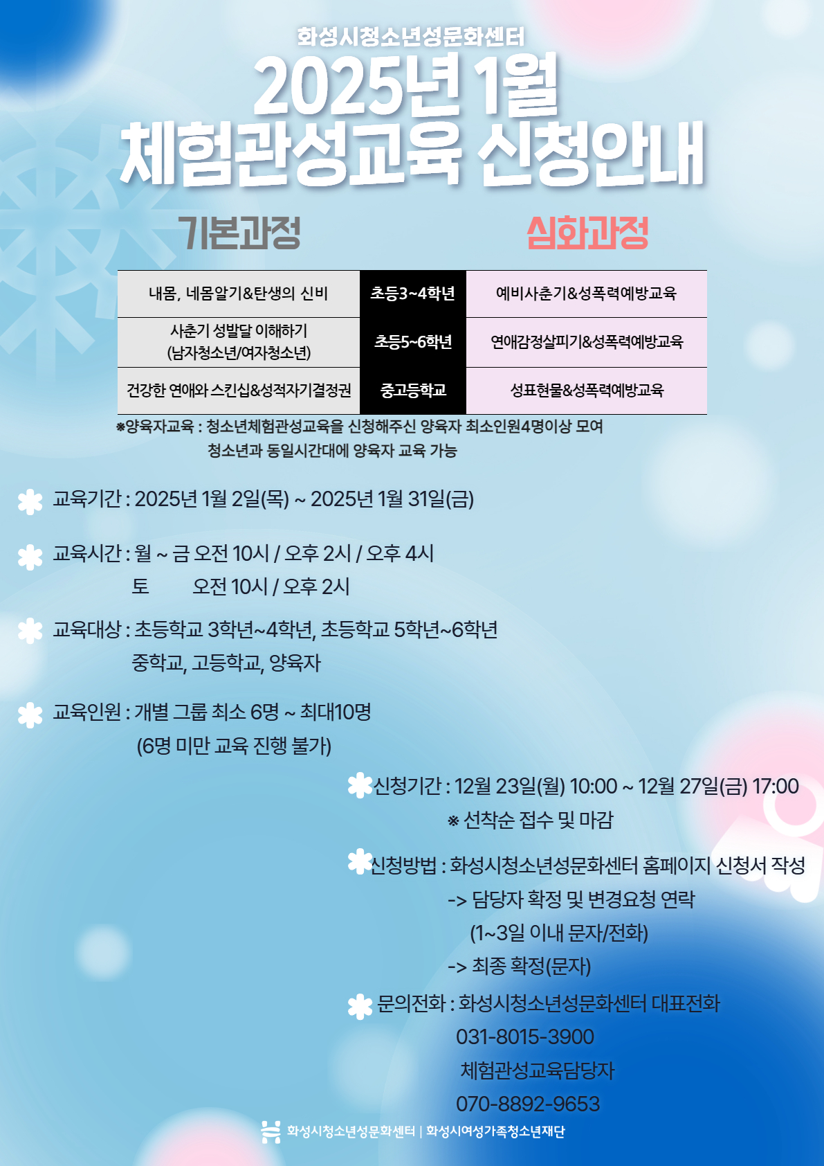 화성시청소년성문화센터 2025년 1월 체험관성교육 신청 안내 드립니다.