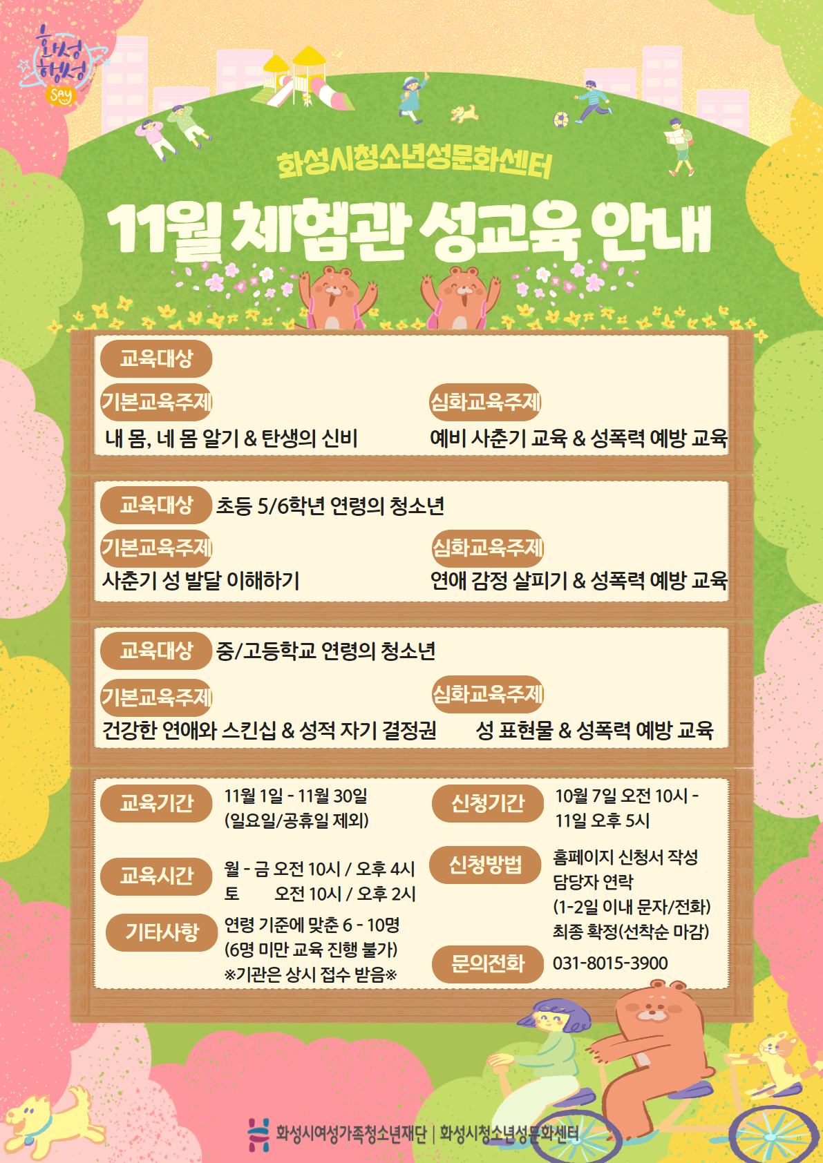화성시청소년성문화센터 2024년 10월 체험관성교육 신청 안내 드립니다.