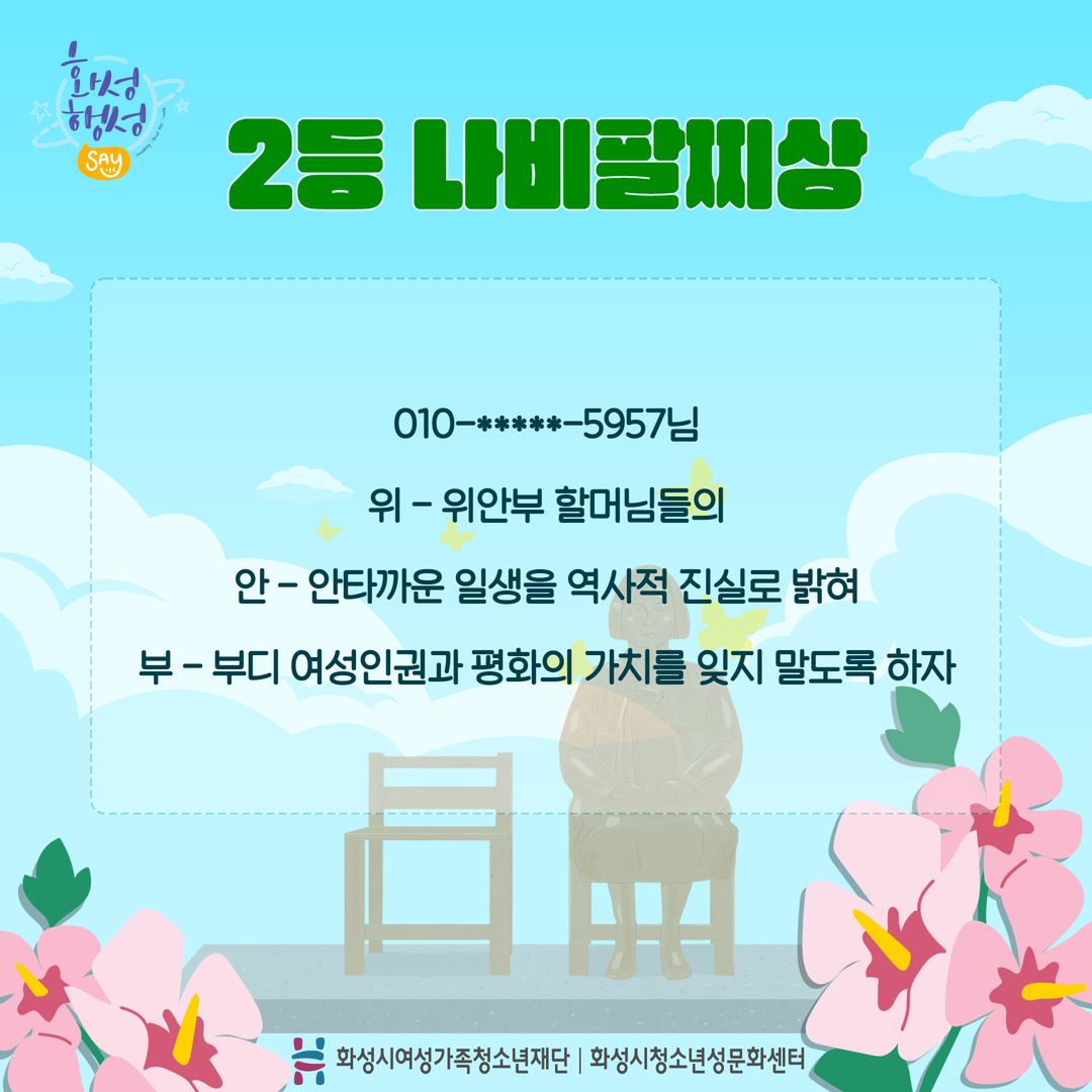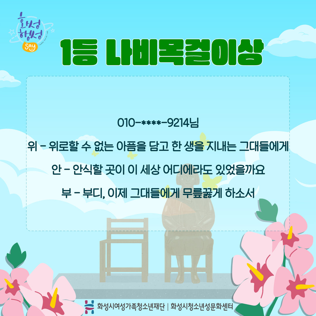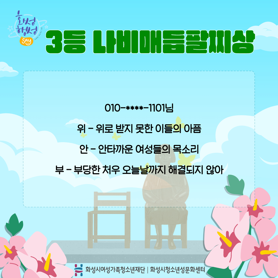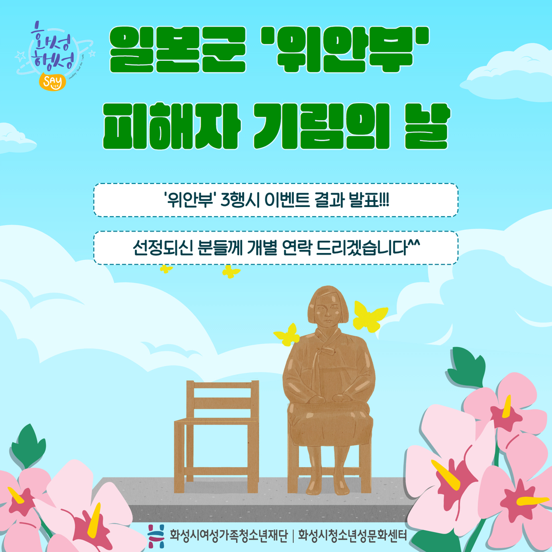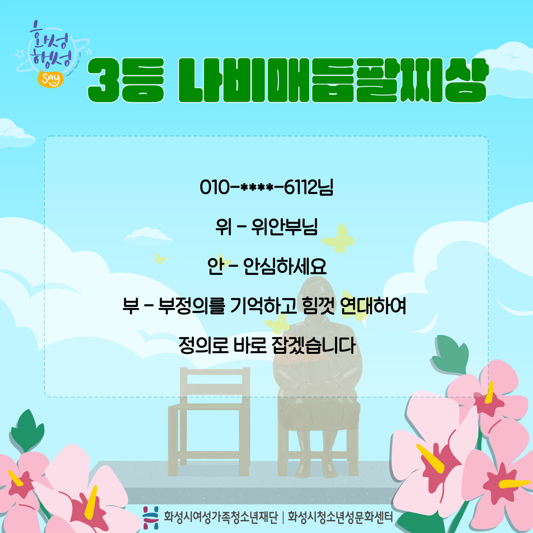 안녕하세요 [화성시청소년성문화센터] 입니다. 지난 8월 14일 일본군 '위안부' 피해자 기림의 날을 맞이하여 카드뉴스 게시와 함께 '위안부'로 3행시를 짓는 이벤트를 진행하였는데요^^ 두구두구두구~~~!!! 결과발표를 합니다. 총5분 선정 되었으며 순차적으로 개별 연락 드리겠습니다. 참여해주신 모든 분들께 감사 인사를 전합니다.^^