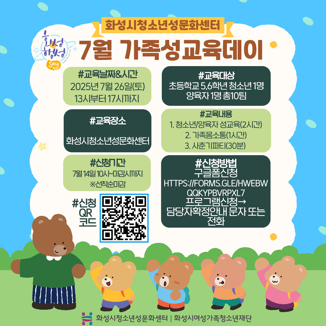 7월 가족성교육데이를 진행합니다. 사춘기를 맞이하는 청소년과 양육자가 함께하는 가족친화 체험형 성교육입니다. 1. 교육날짜 : 2025년 7월 26일(토) 13:00 ~ 17:00 2. 교육장소 : 화성시청소년성문화센터(화성시 능동 여울로2길 33) 3. 참여대상: 청소년(초등5~6학년)과 양육자 총 10팀 4. 주요내용: 청소년성교육/양육자성교육, 가족몸소통, 사춘기파티 5. 신청기간: 2025년 7월 14일 10시 ~ 모집마감시까지 6. 신청방법 : 구글폼 신청 후 담당자 확정 연락예정 https://forms.gle/ezb6JdvU95VL91AaA 7. 문의: 화성시청소년성문화센터 가족성교육데이 담당자 031-8015-3900/070-8892-9652 |