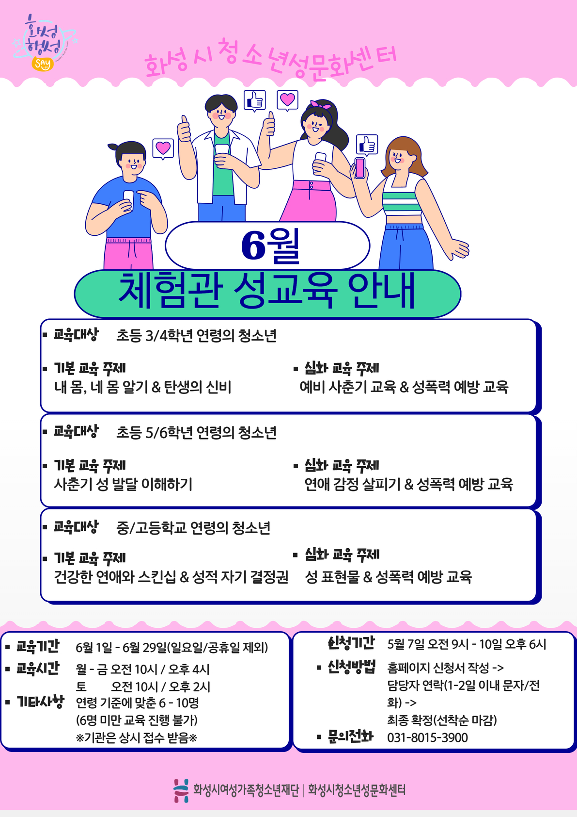 | 제목 | 화성시청소년성문화센터 2024년 6월 체험관 교육 신청 안내(9시 30분부터 접수 가능합니다) | ||||||||||||||||||||||||||